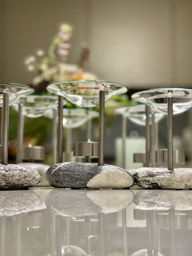 Jeder Stein ist ein Unikat. Alle Metallteile sind von Hand gefertigt aus rostfreiem Edelstahl, das Glas hochwertige Qualität.