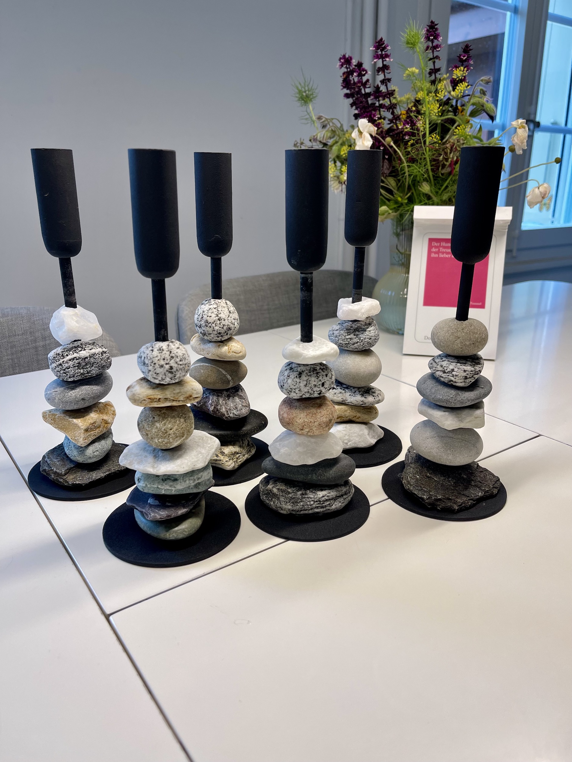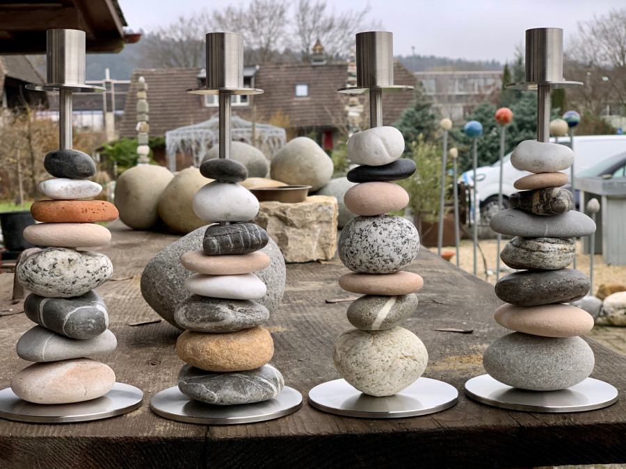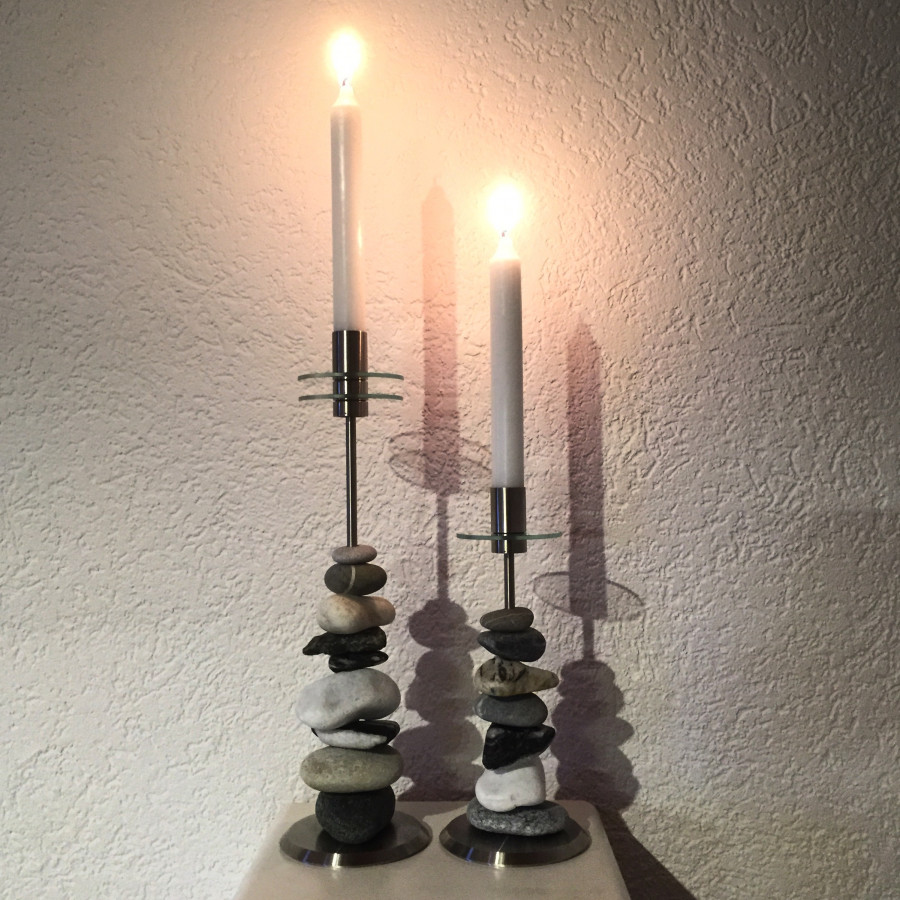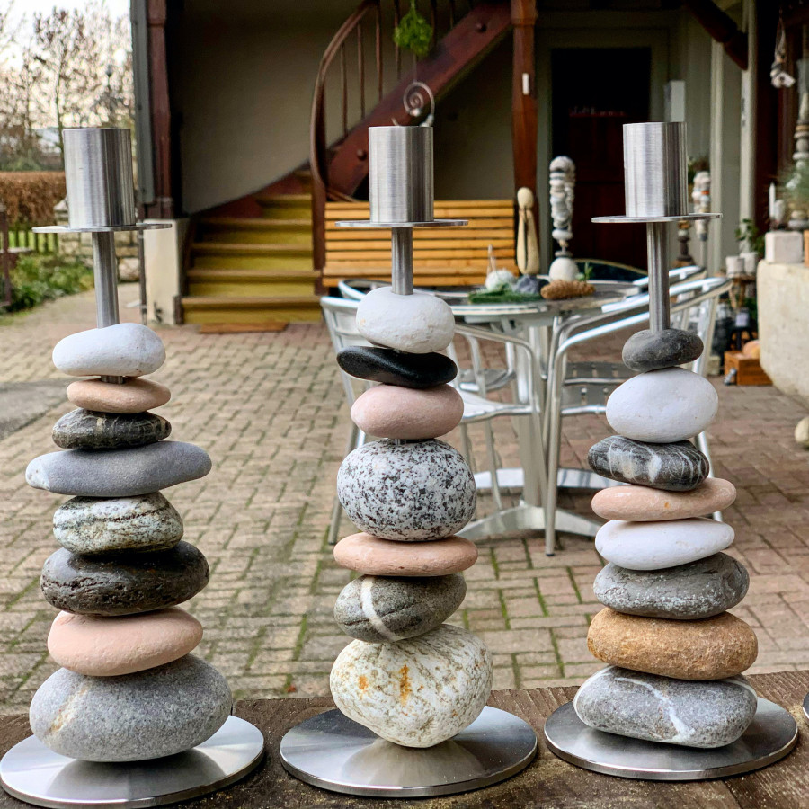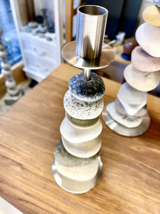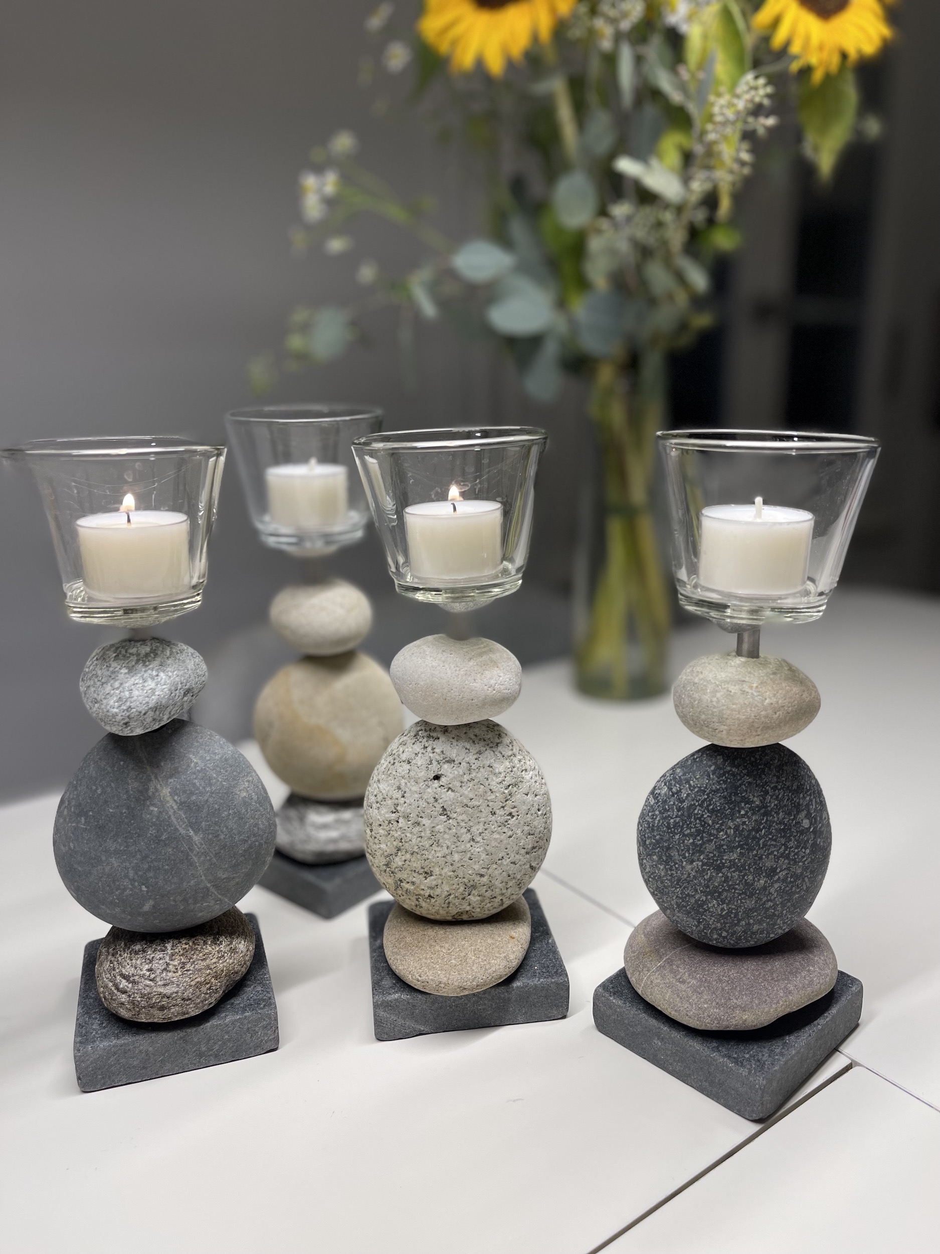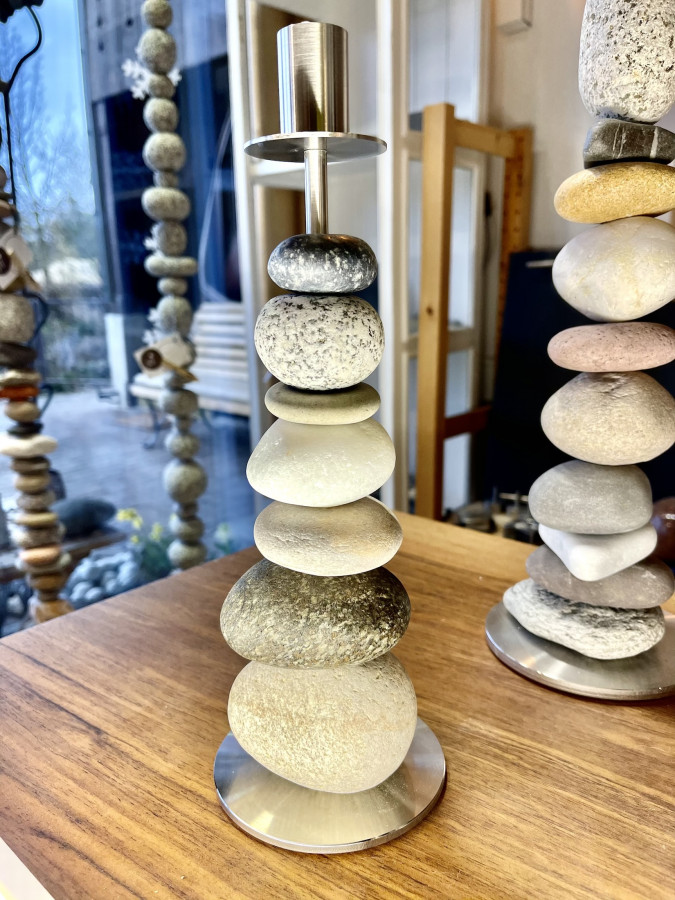 Ausgewählte Kieselsteine, einige geöhlt, andere getrommelt, machen den Reiz dieser einzigartigen Kerzenständer aus.