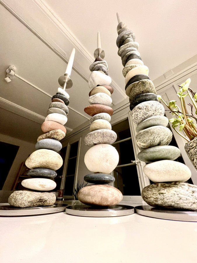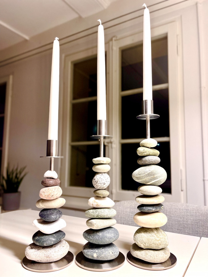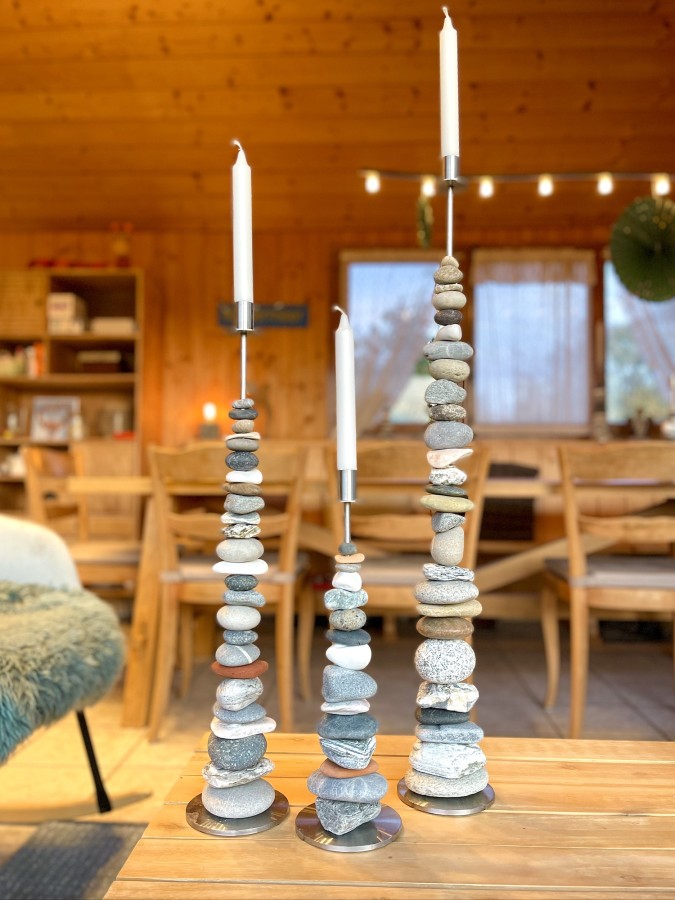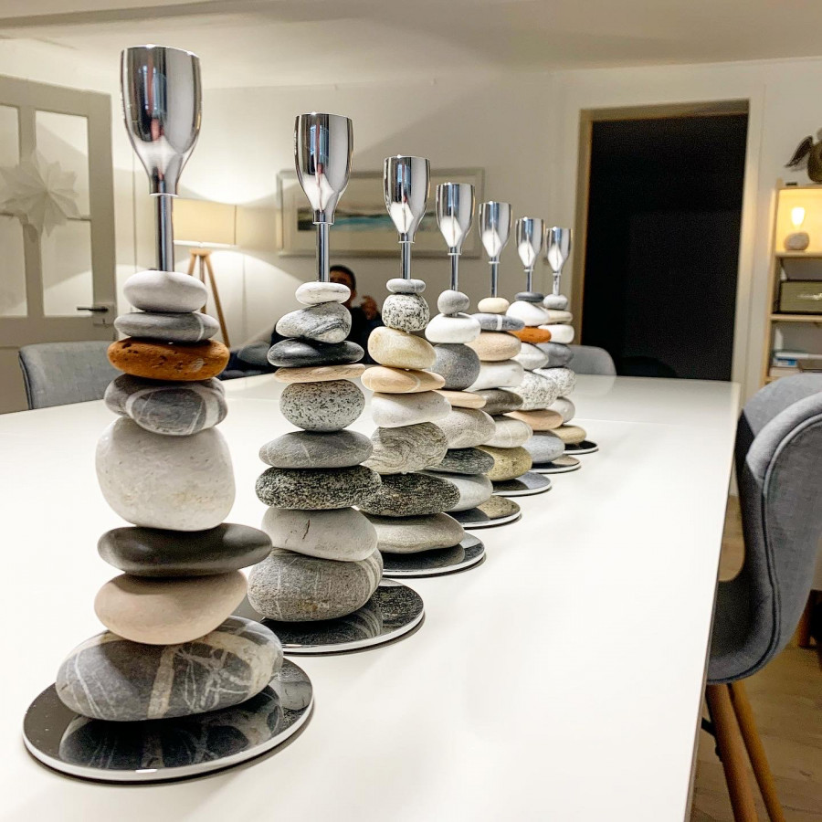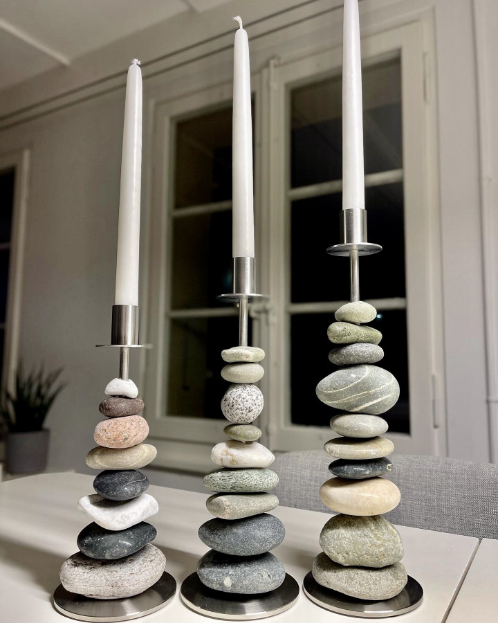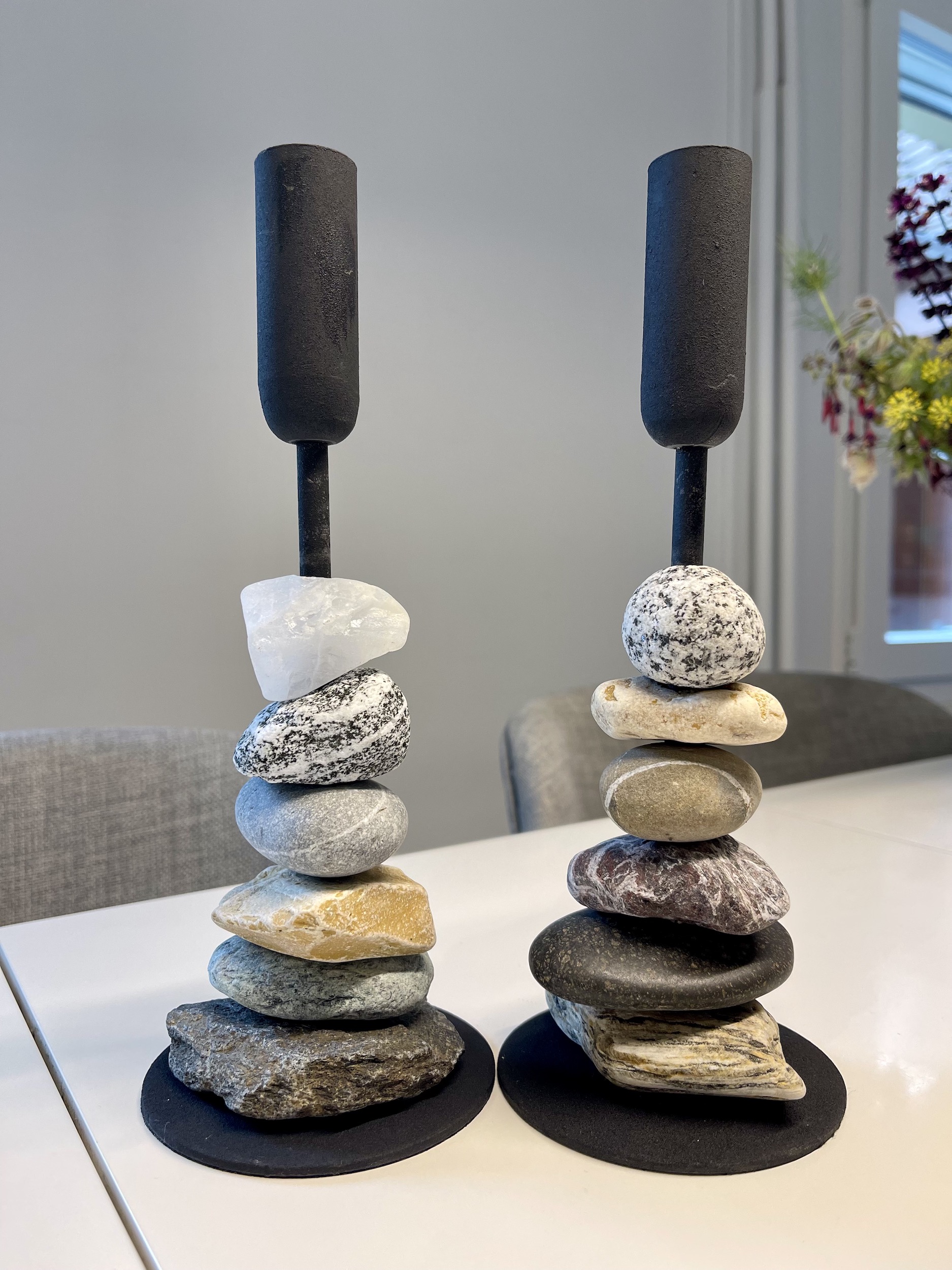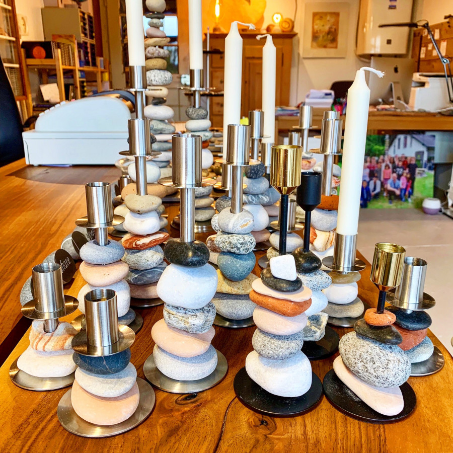 Ausgewählte Kieselsteine, einige geöhlt, andere getrommelt, machen den Reiz dieser einzigartigen Kerzenständer aus.