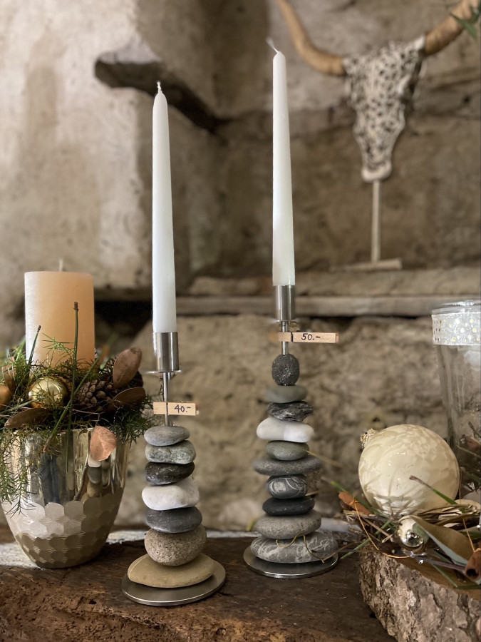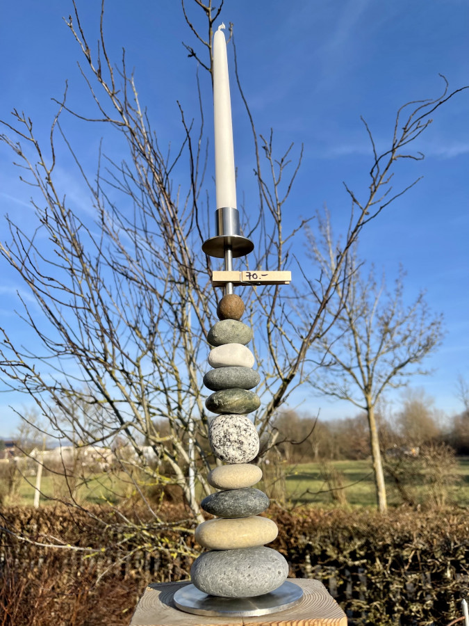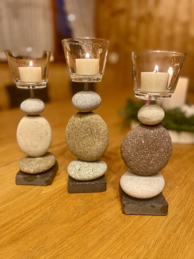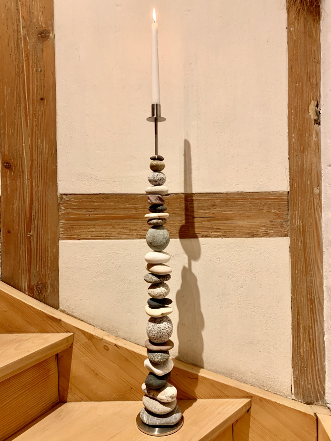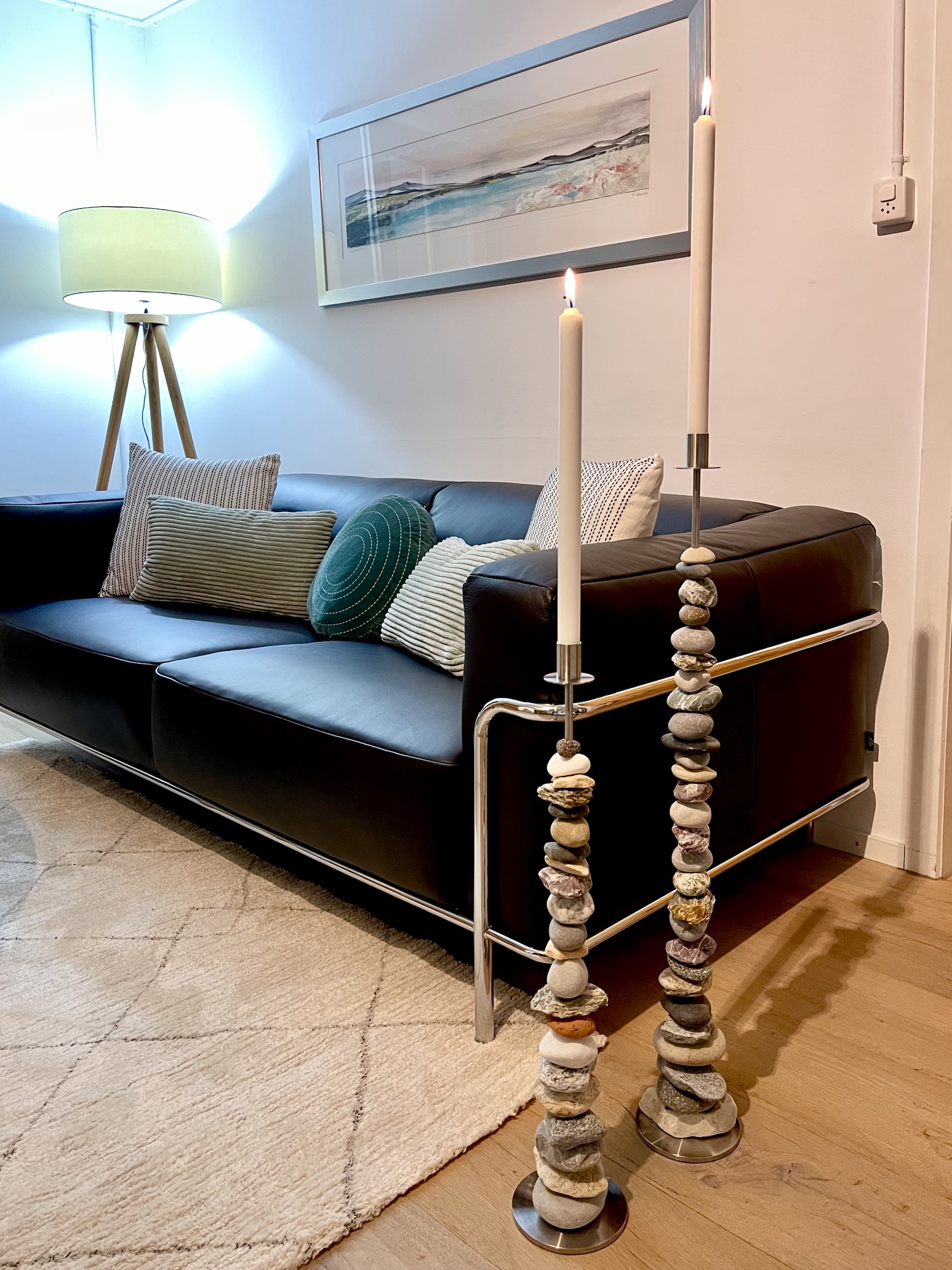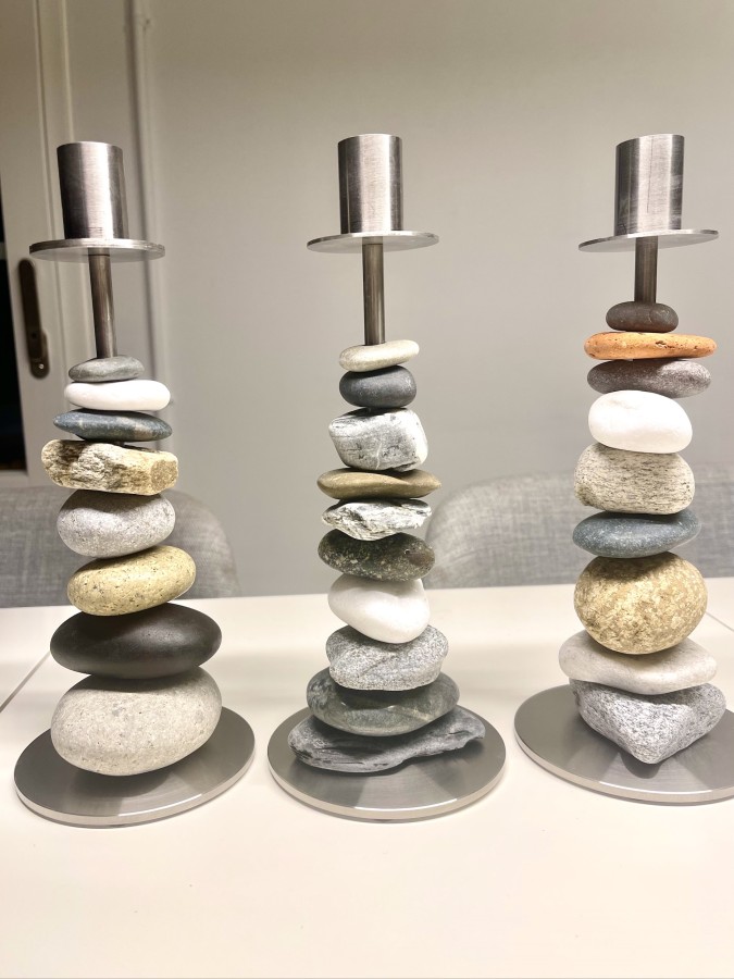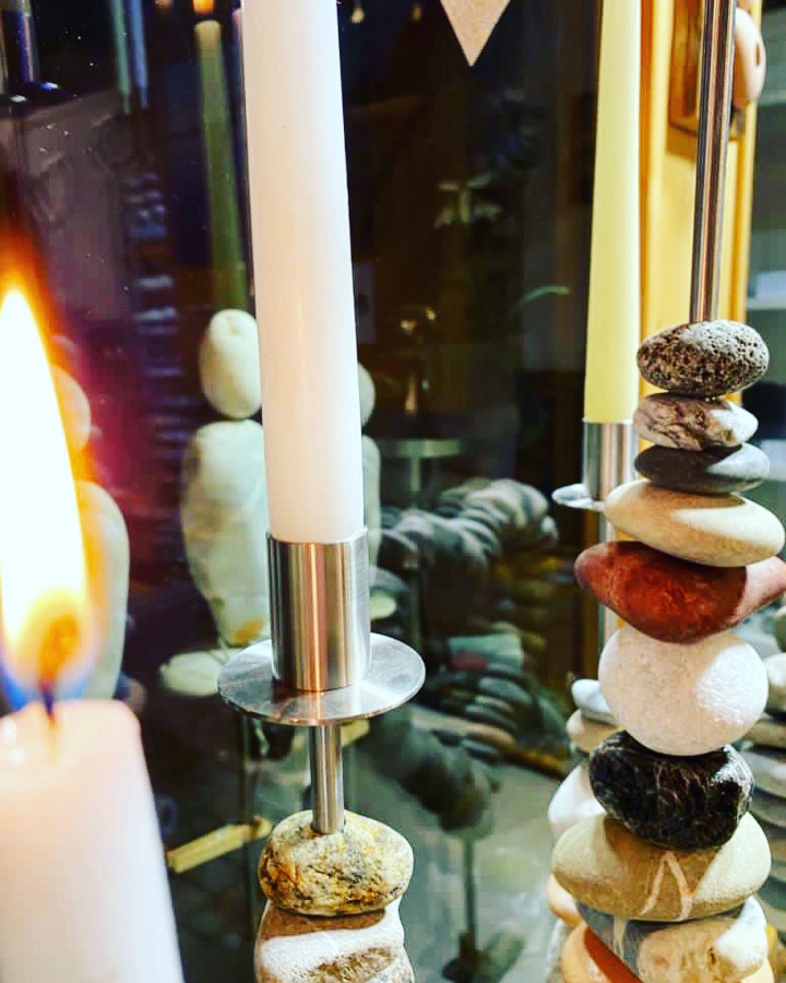 Ausgewählte Kieselsteine, einige geöhlt, andere getrommelt, machen den Reiz dieser einzigartigen Kerzenständer aus.