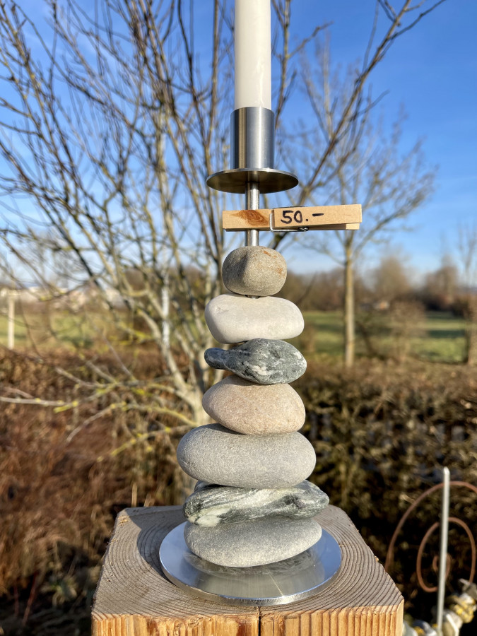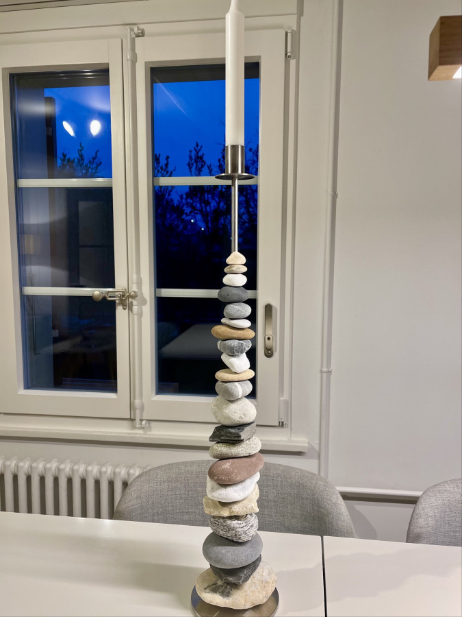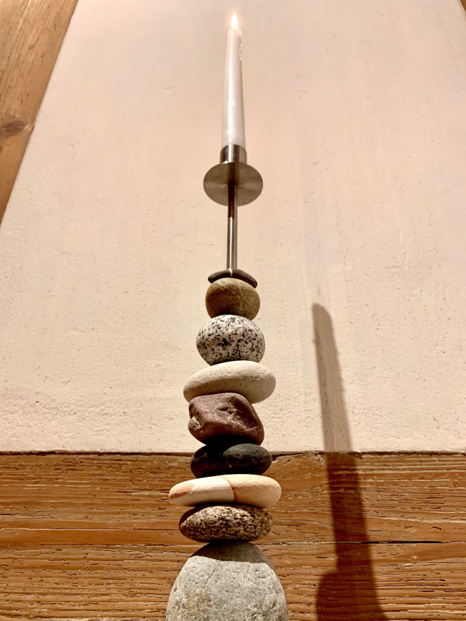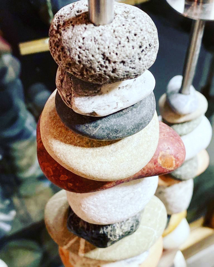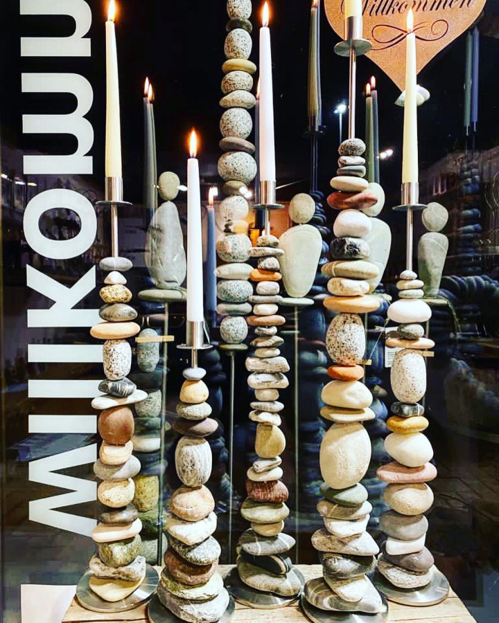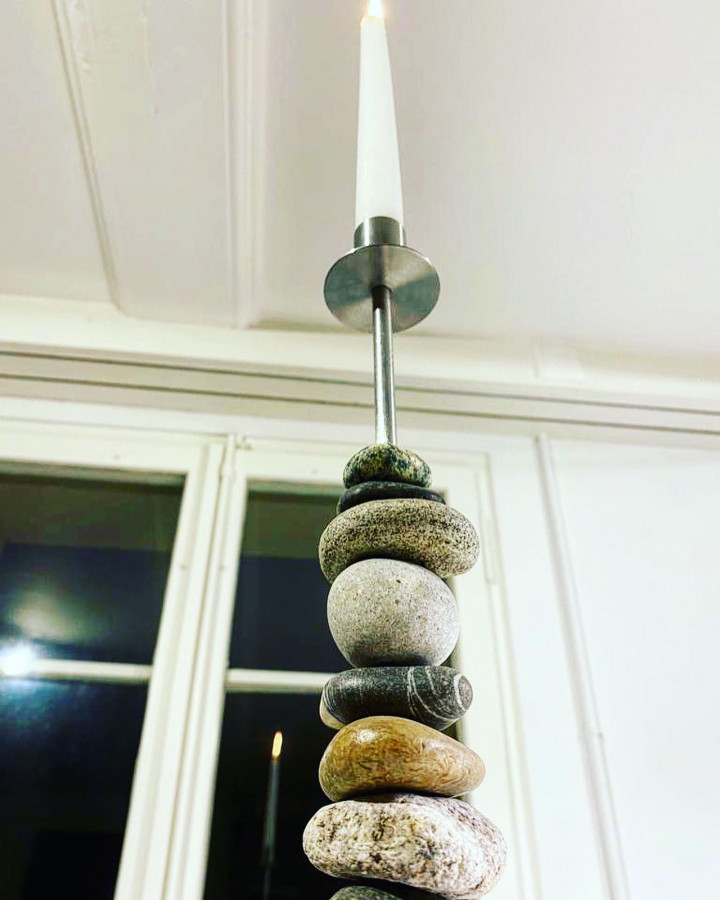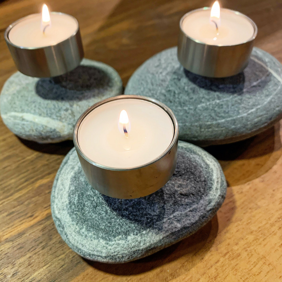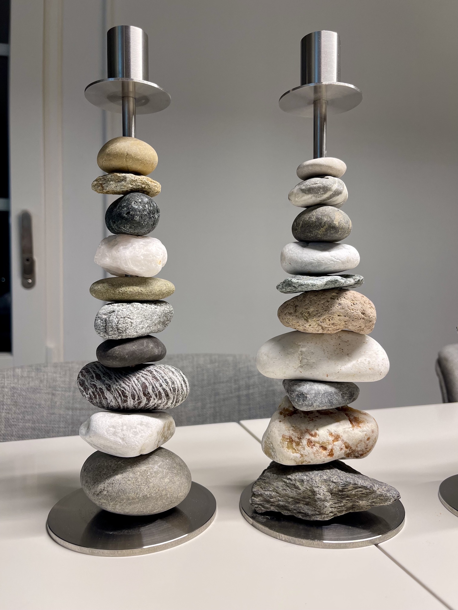 Ausgewählte Kieselsteine, einige geöhlt, andere getrommelt, machen den Reiz dieser einzigartigen Kerzenständer aus.