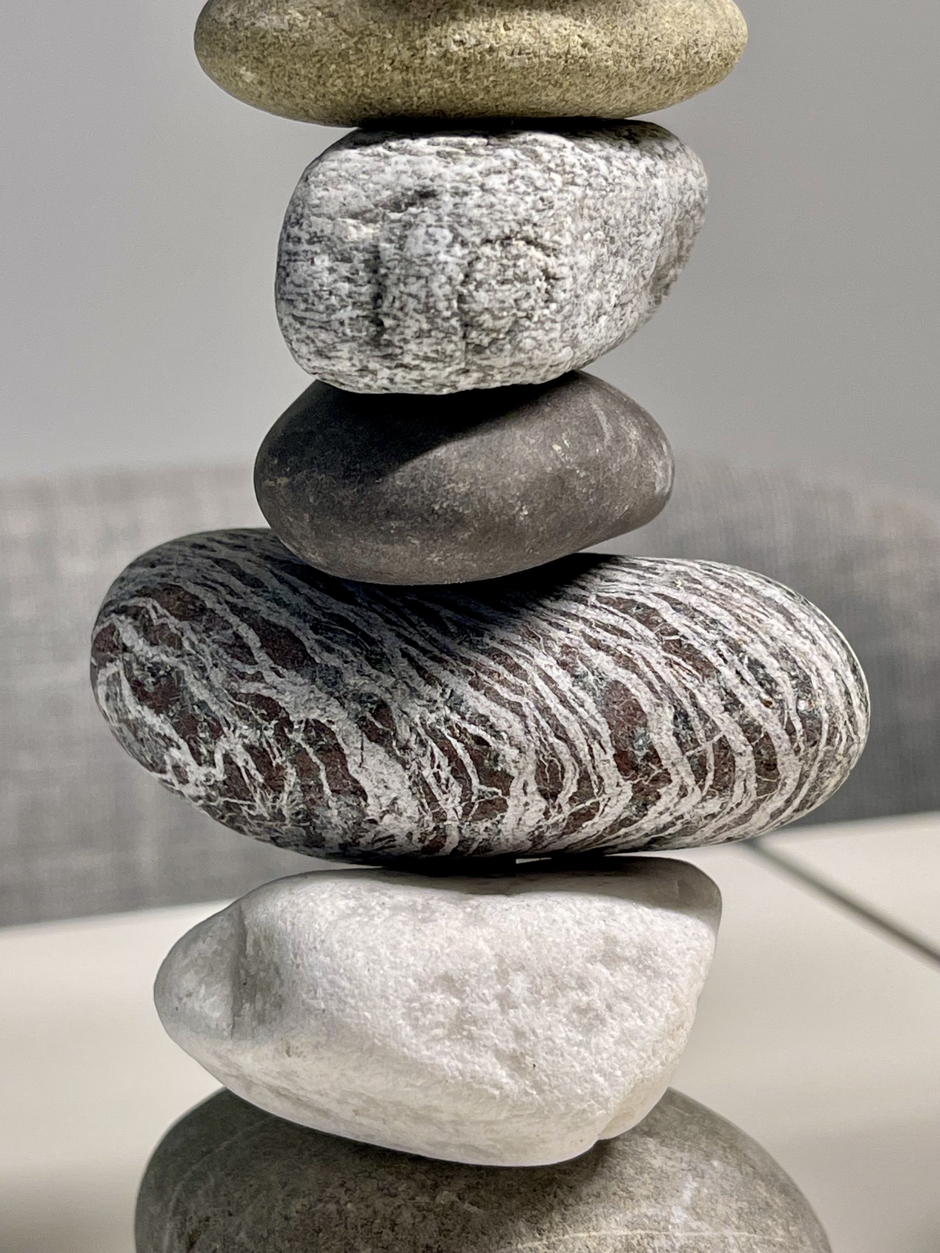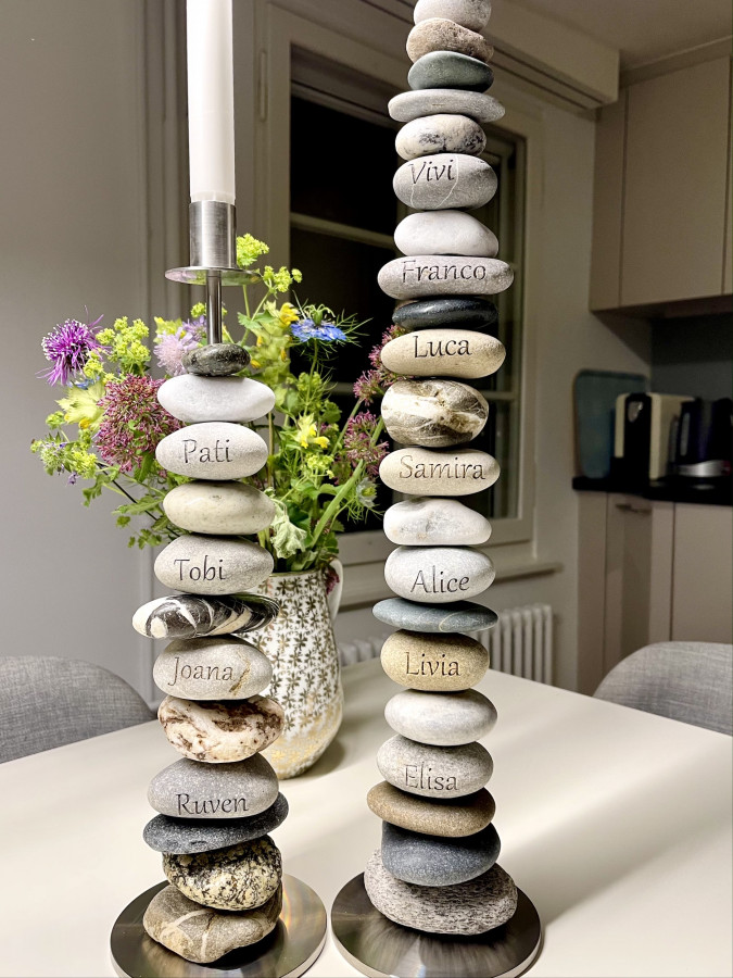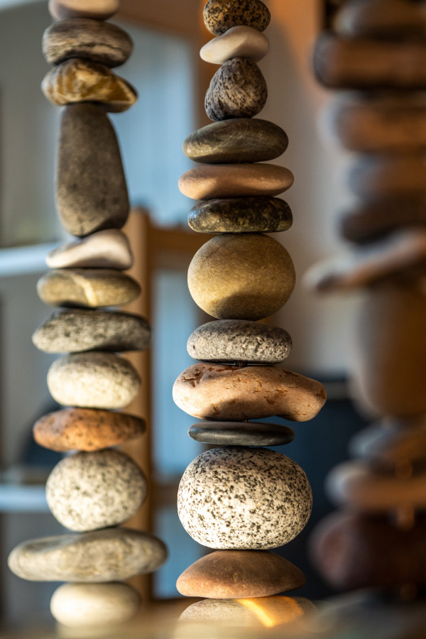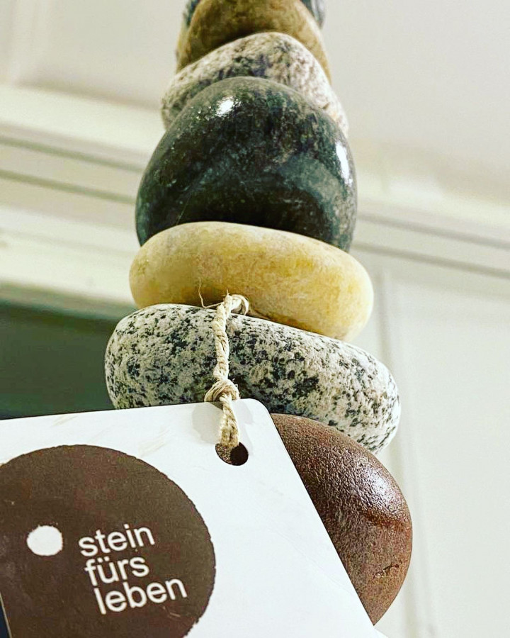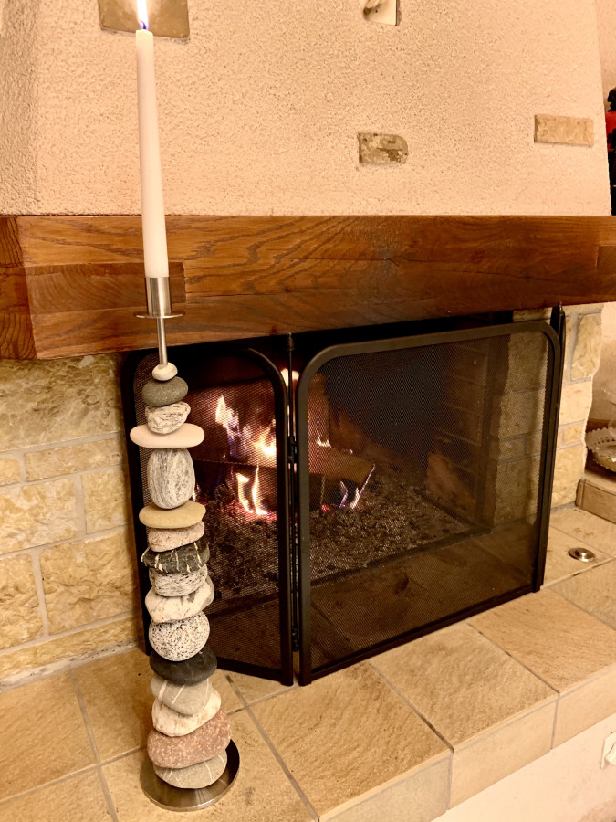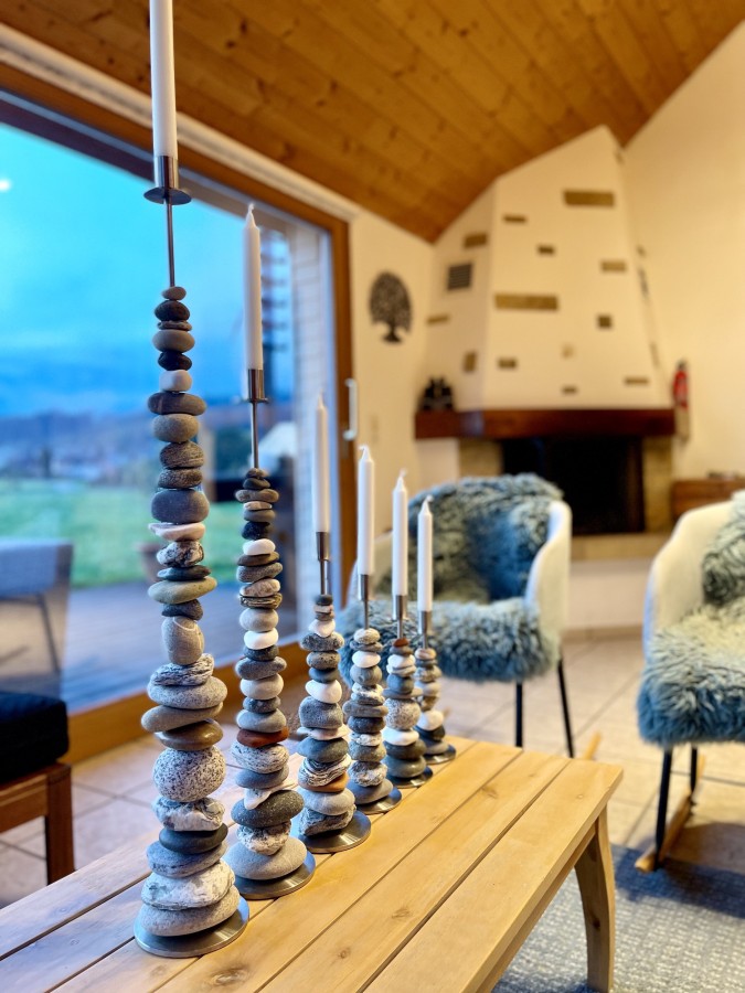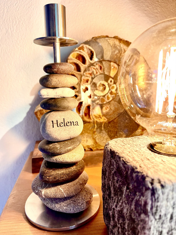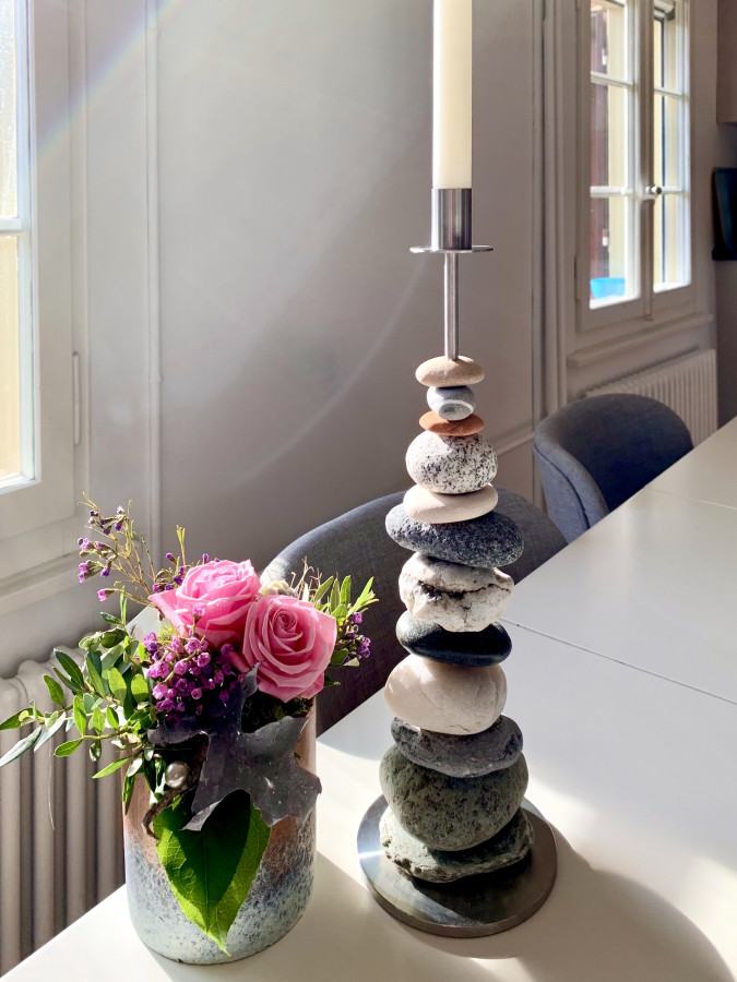 Ausgewählte Kieselsteine, einige geöhlt, andere getrommelt, machen den Reiz dieser einzigartigen Kerzenständer aus.