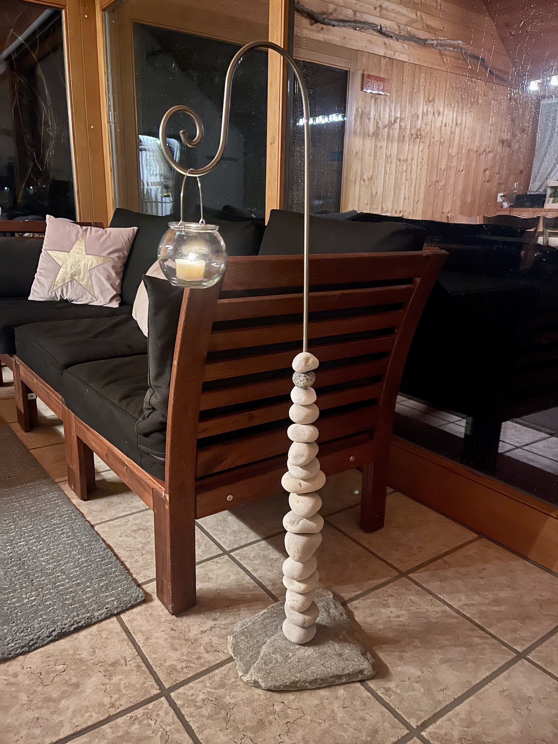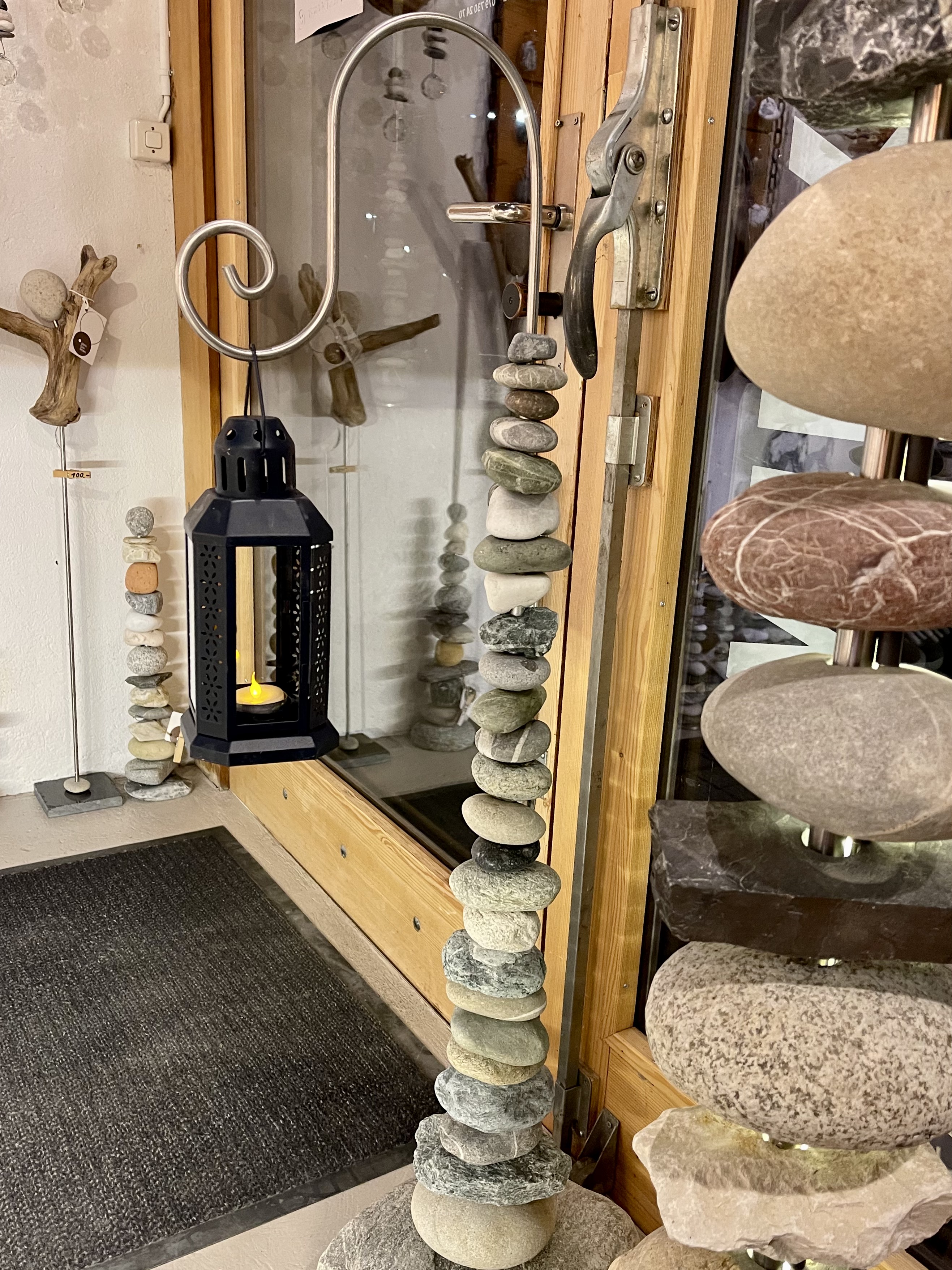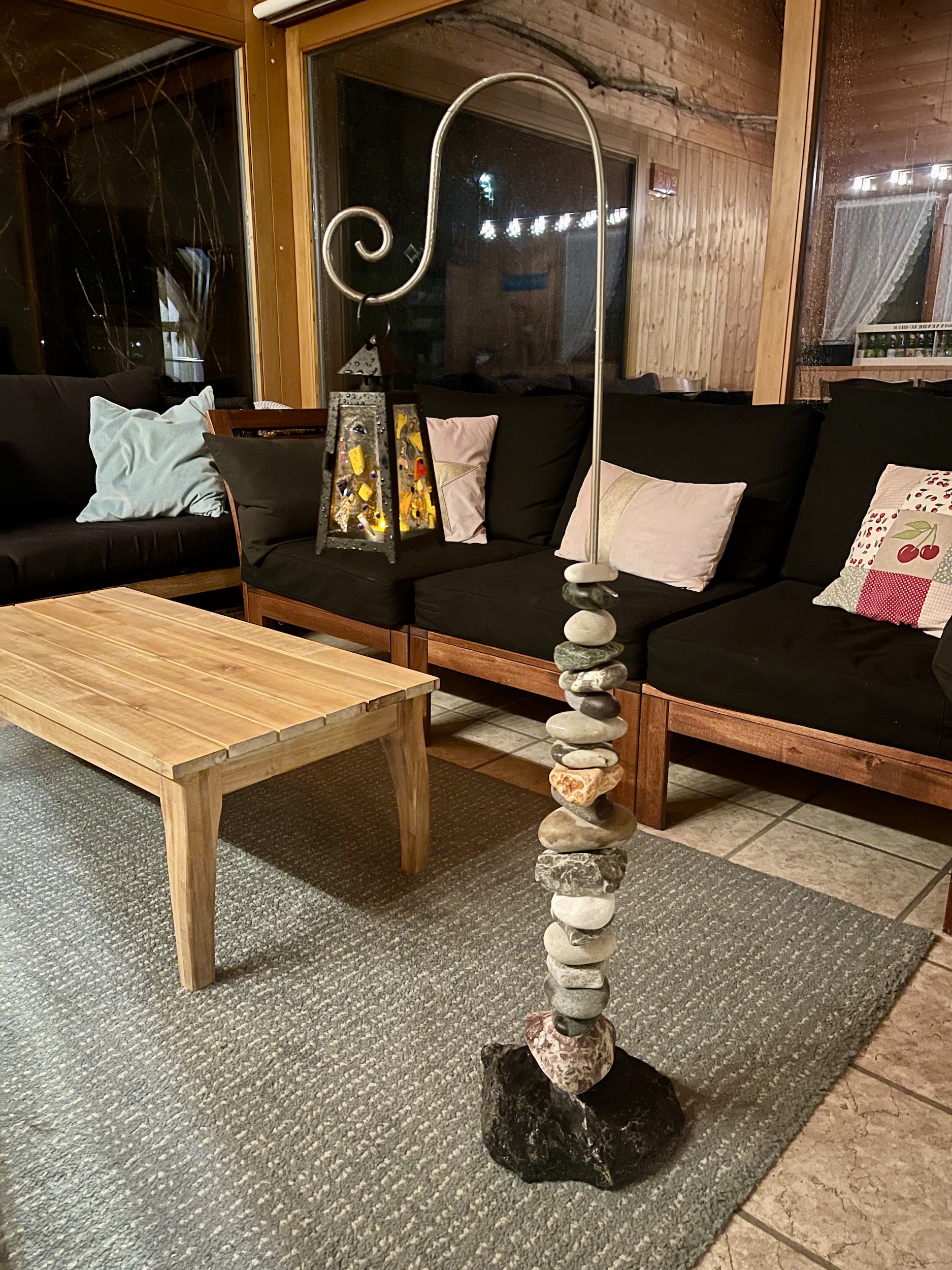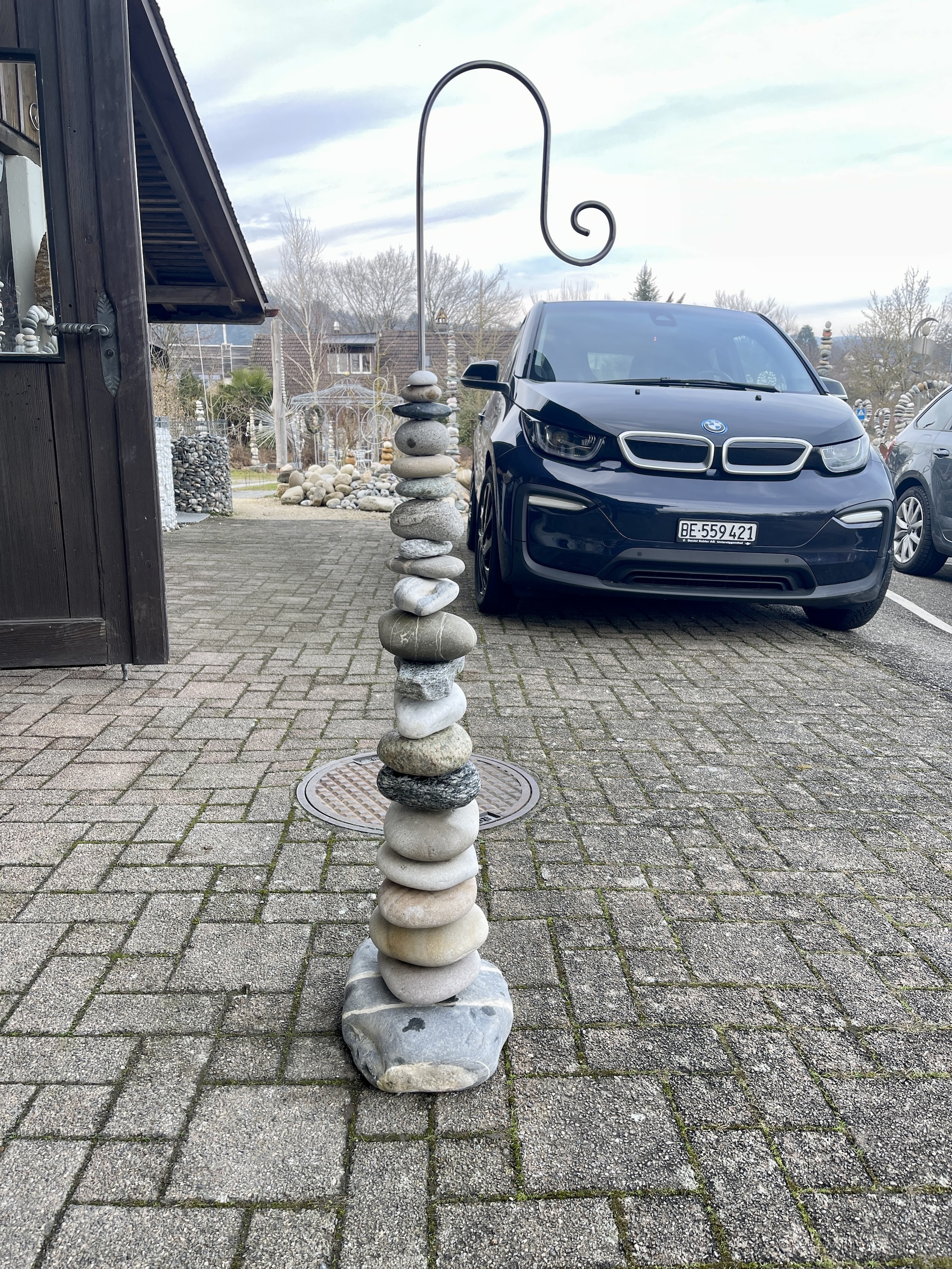 Der stabile Steinsockel mit den vielen megaschönen Kieselsteinen aus der Emme ist ein Kunstwerk für drinnen oder draussen.