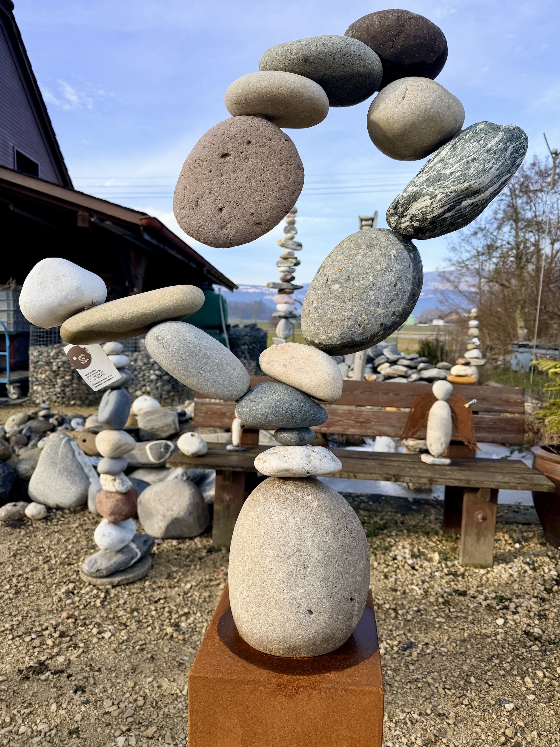Bedeutsame Wörter für den Lebensraum Garten, aufgefädelt wie Stein auf Stein - Natursteine, unterschiedlicher Form und Beschaffenheit, stimmig aufgefädelt zum Kunstwerk, seien es Steintürme, Pilgerstäbe, Gartenstelen, Steinherzen, Lebenskreise, Steinbogen, Steinkreise und Individuelles - Steinkunstwerke, die zum Herzstück und somit zum Blickfang im Garten werden …