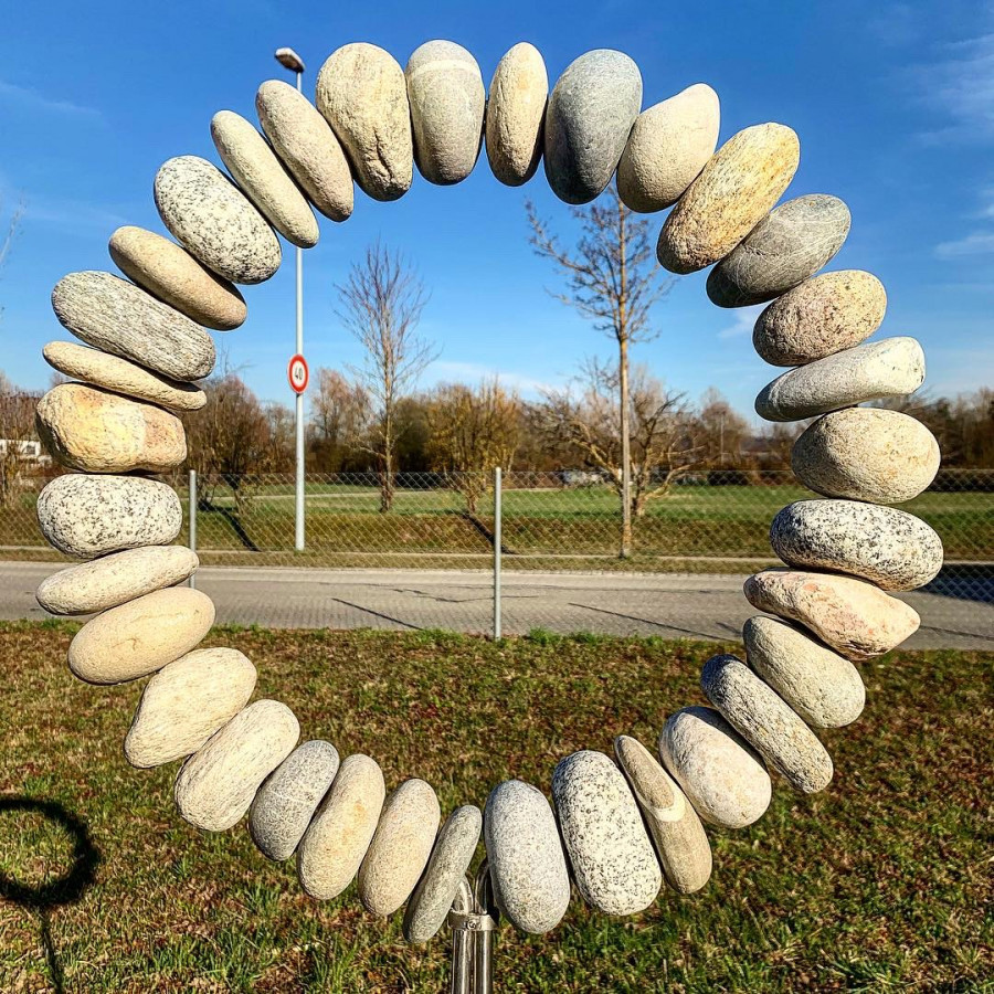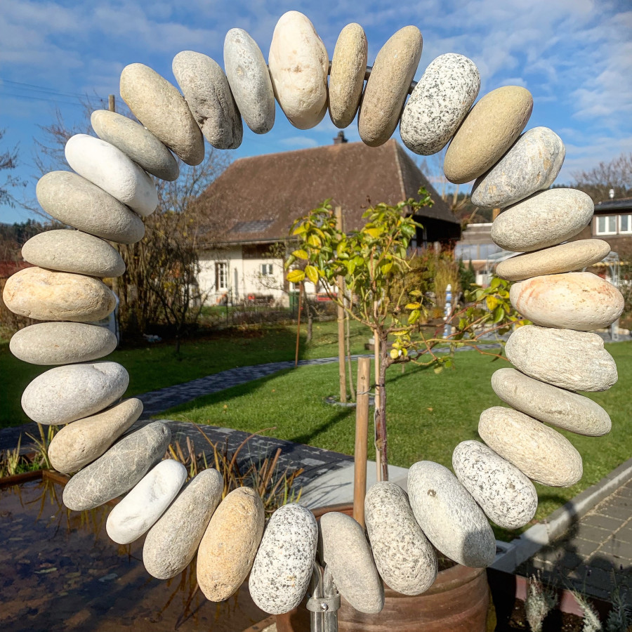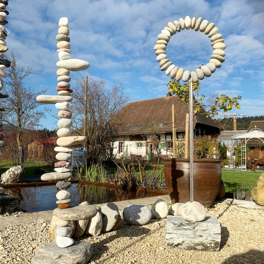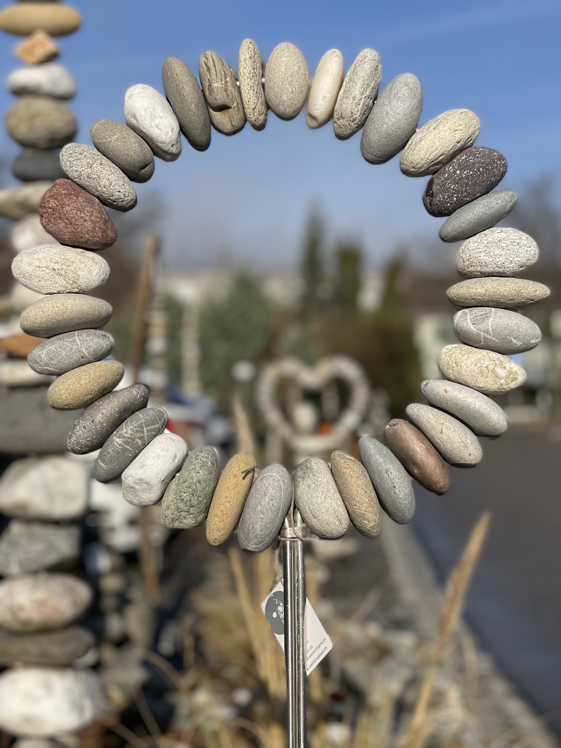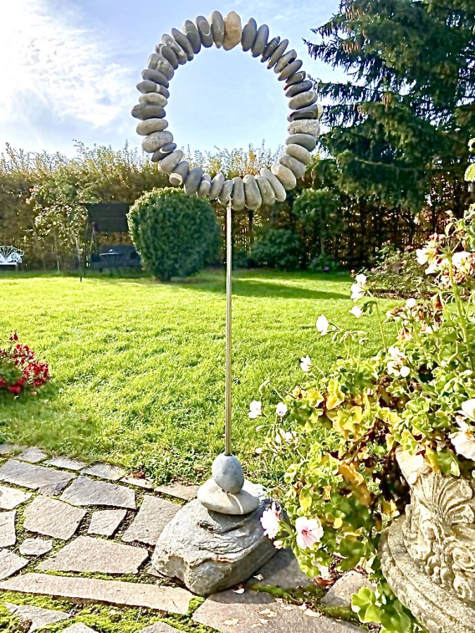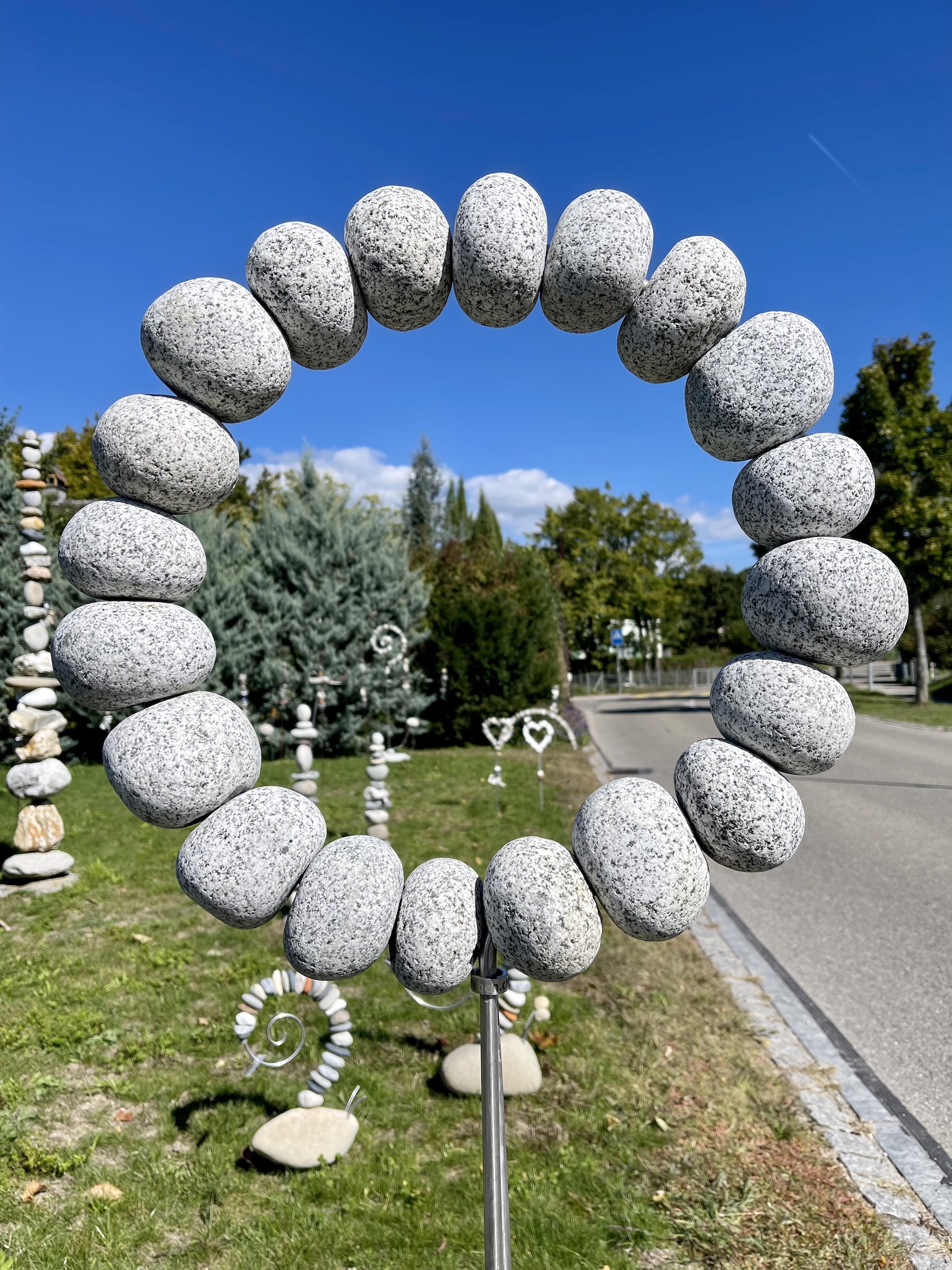 Steinkreise sind ganz besonders ausdrucksstarke Kunstwerke in deinem Garten oder auf dem Balkon. Majestätisch und doch leicht ragt das 140 cm hohe Naturkunstwerk in den Himmel. Schlicht und einfach - ein Steinkreis wie aus Kinderhand mit Kieselsteinen gelegt.