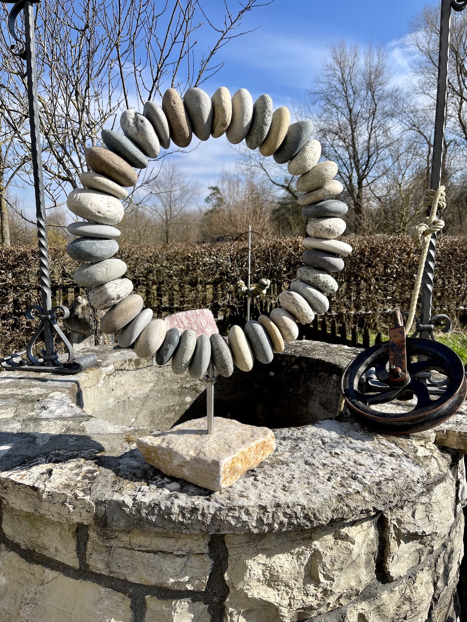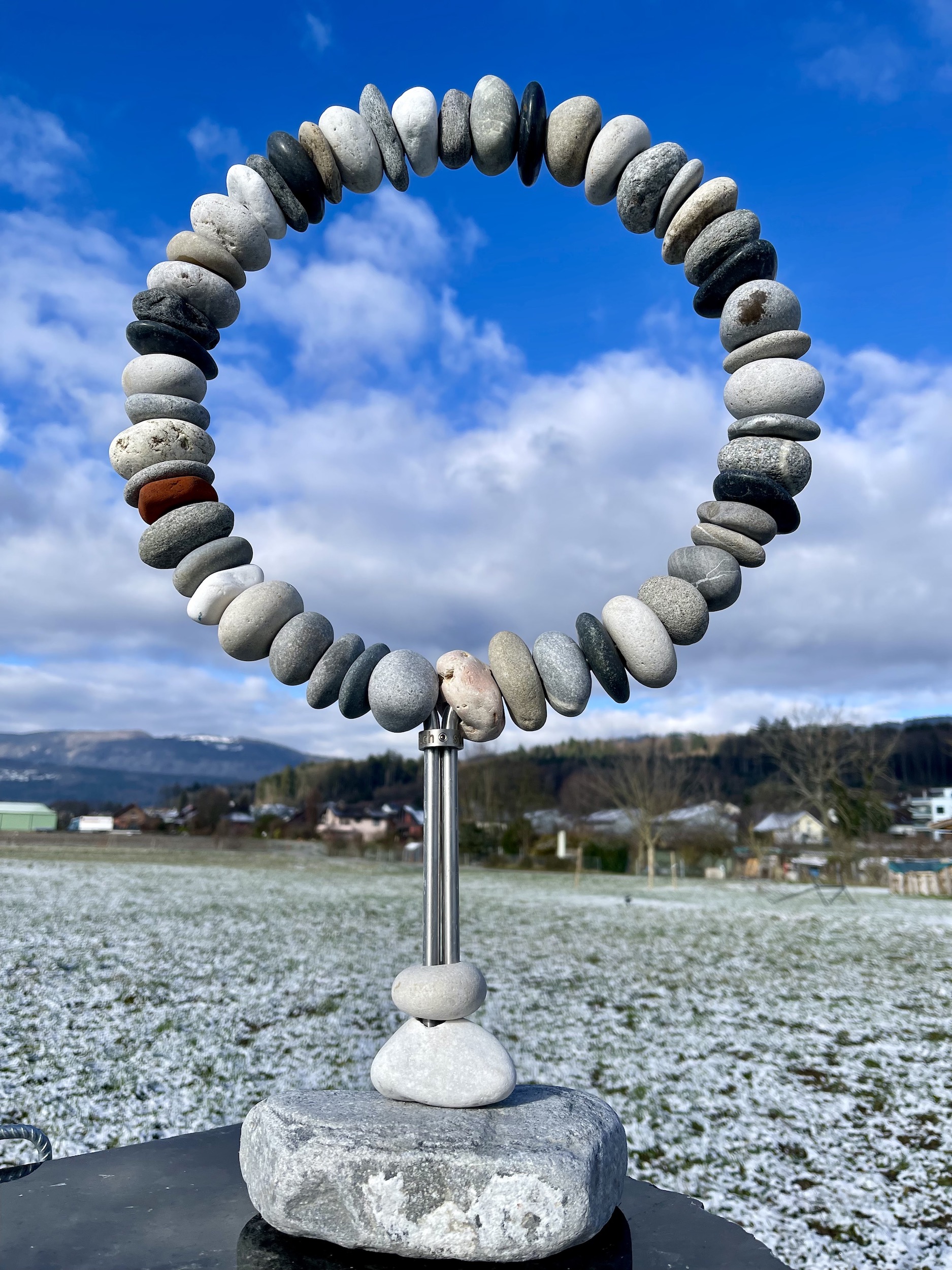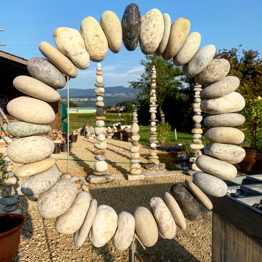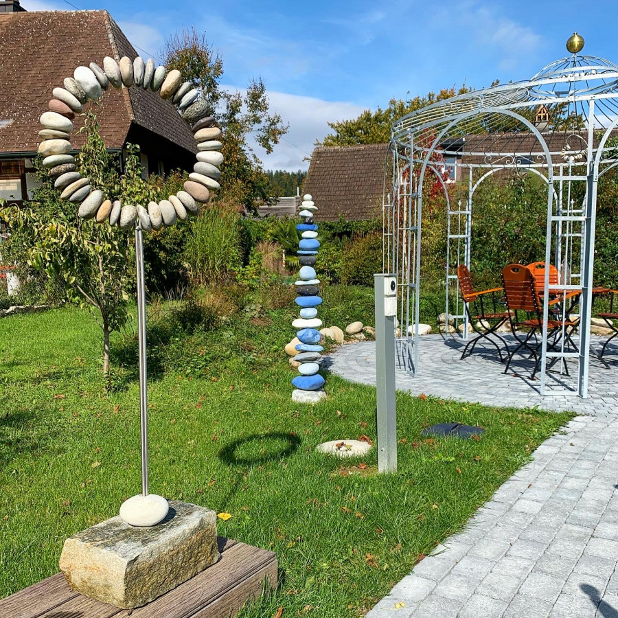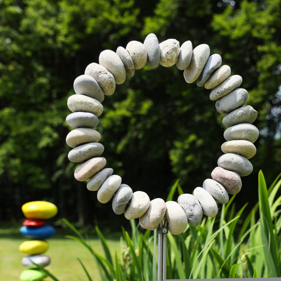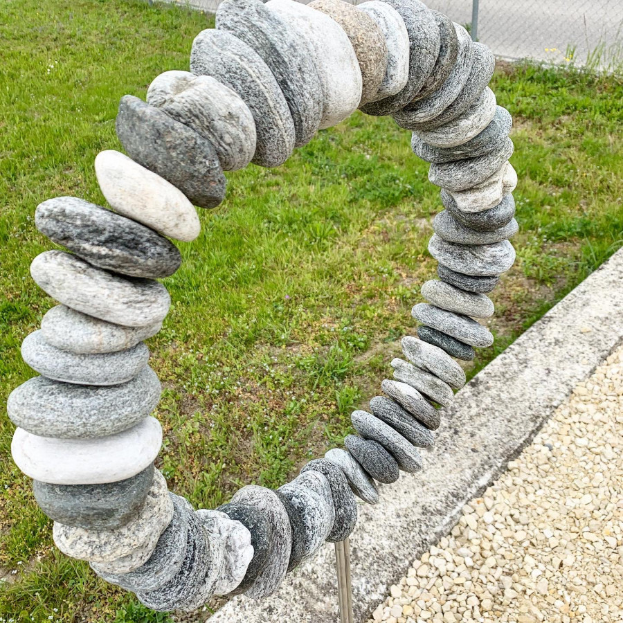 Steinkreise sind ganz besonders ausdrucksstarke Kunstwerke in deinem Garten oder auf dem Balkon. Majestätisch und doch leicht ragt das 140 cm hohe Naturkunstwerk in den Himmel. Schlicht und einfach - ein Steinkreis wie aus Kinderhand mit Kieselsteinen gelegt.