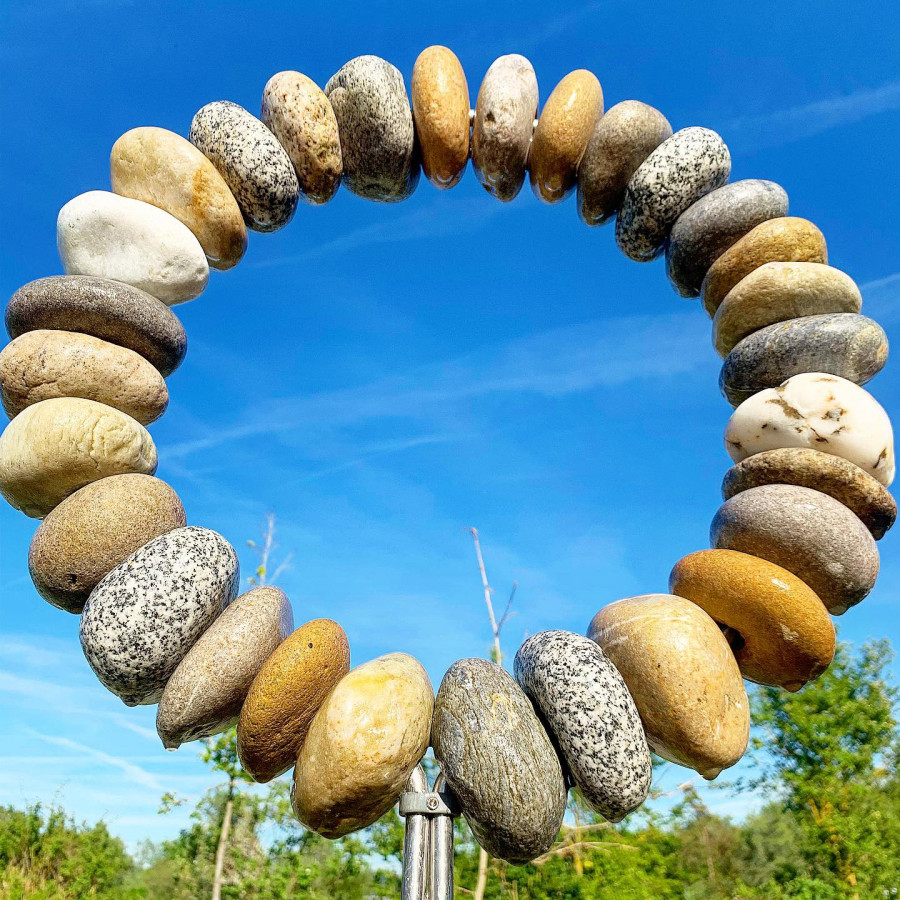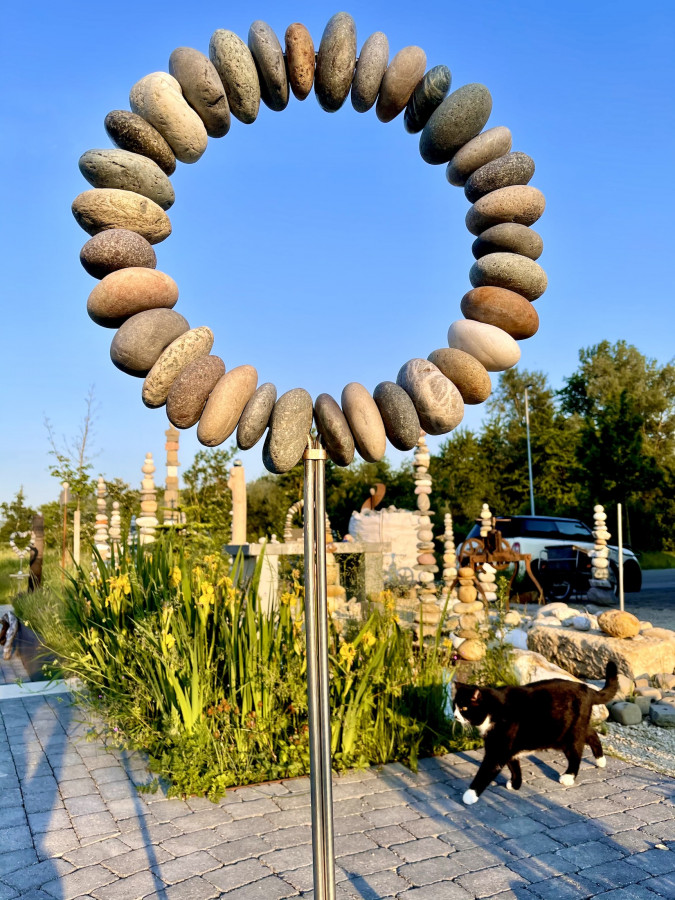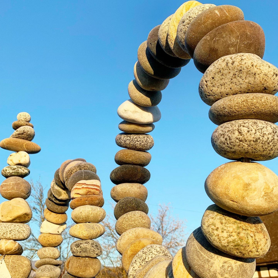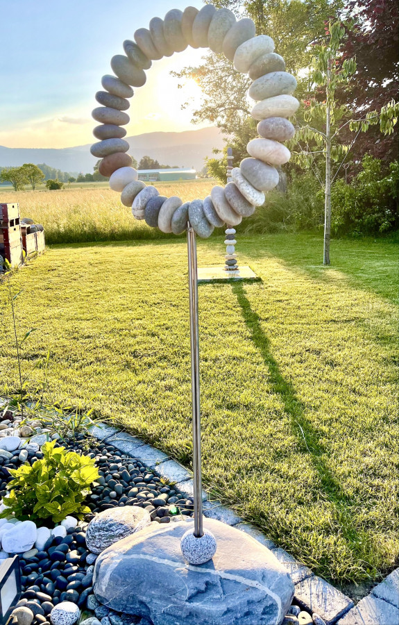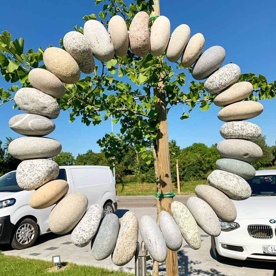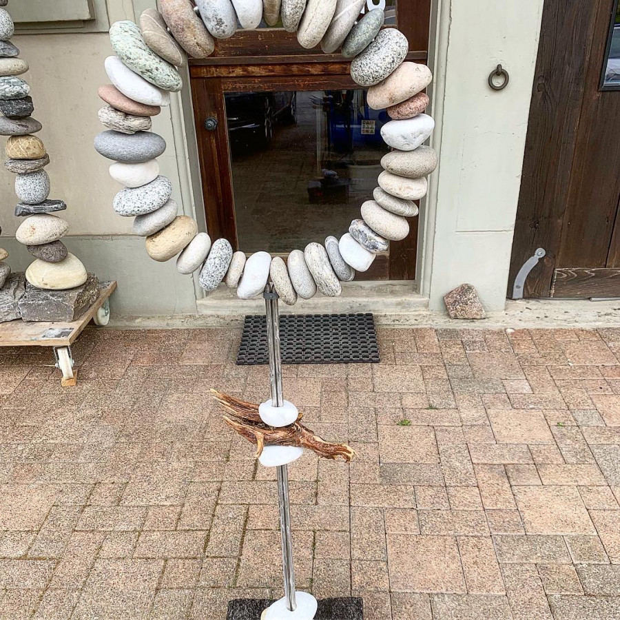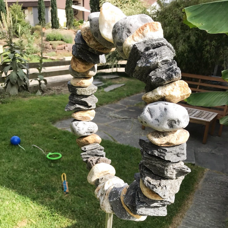 Steinkreise sind ganz besonders ausdrucksstarke Kunstwerke in deinem Garten oder auf dem Balkon. Majestätisch und doch leicht ragt das 140 cm hohe Naturkunstwerk in den Himmel. Schlicht und einfach - ein Steinkreis wie aus Kinderhand mit Kieselsteinen gelegt.