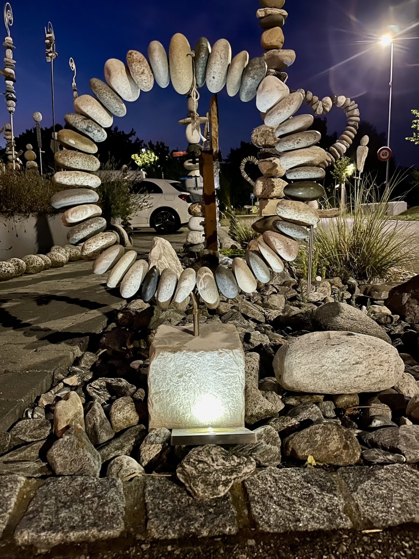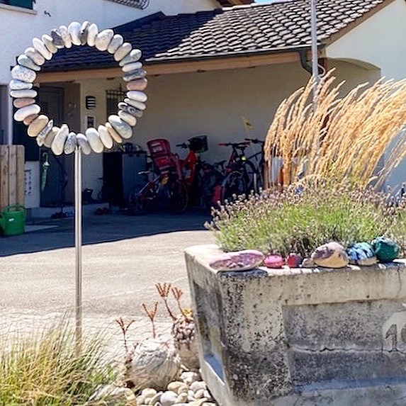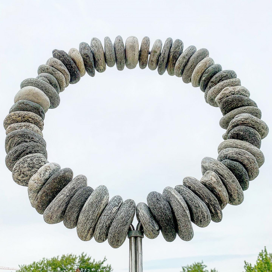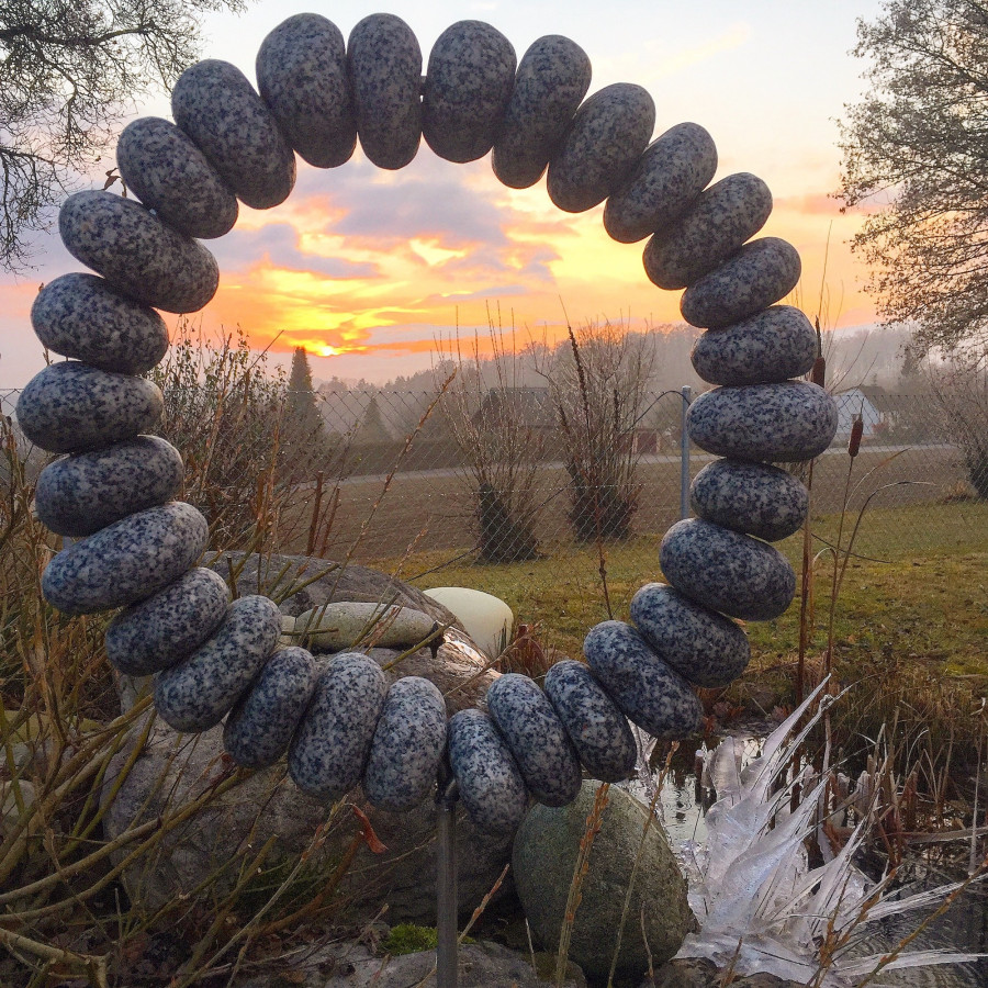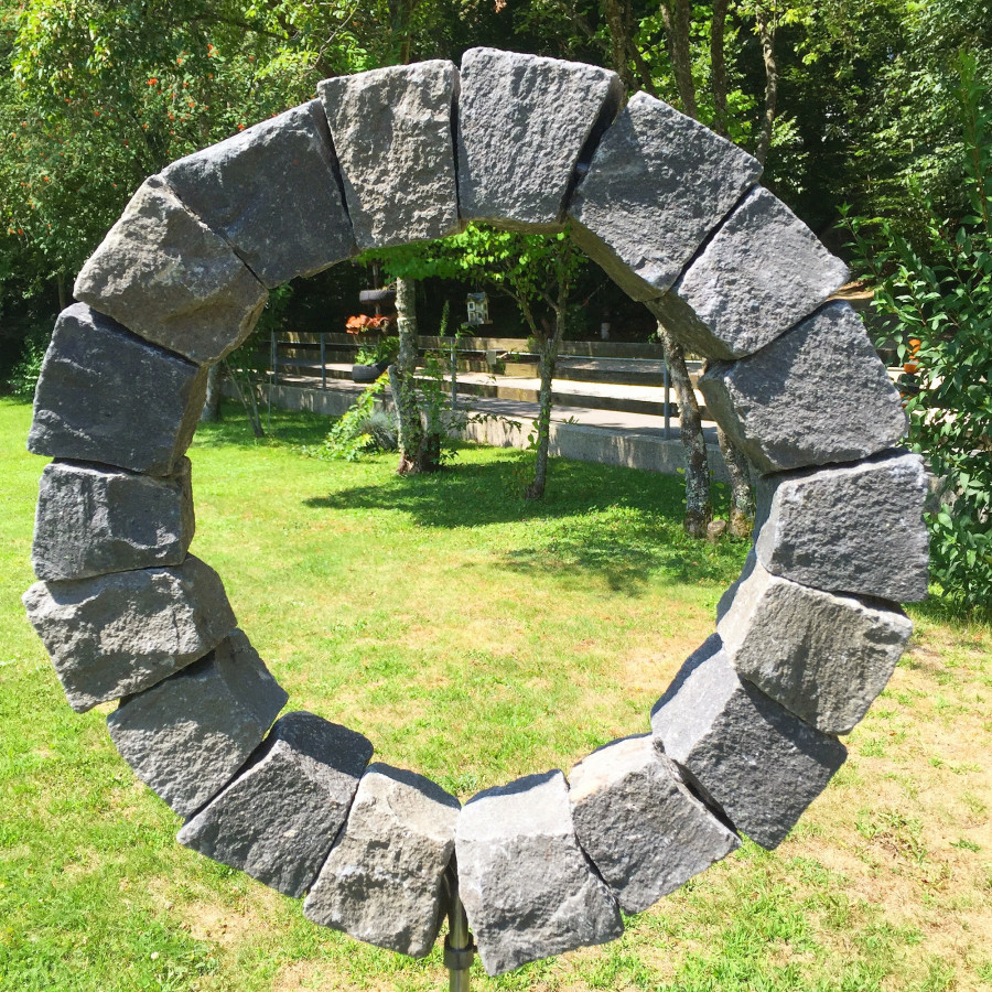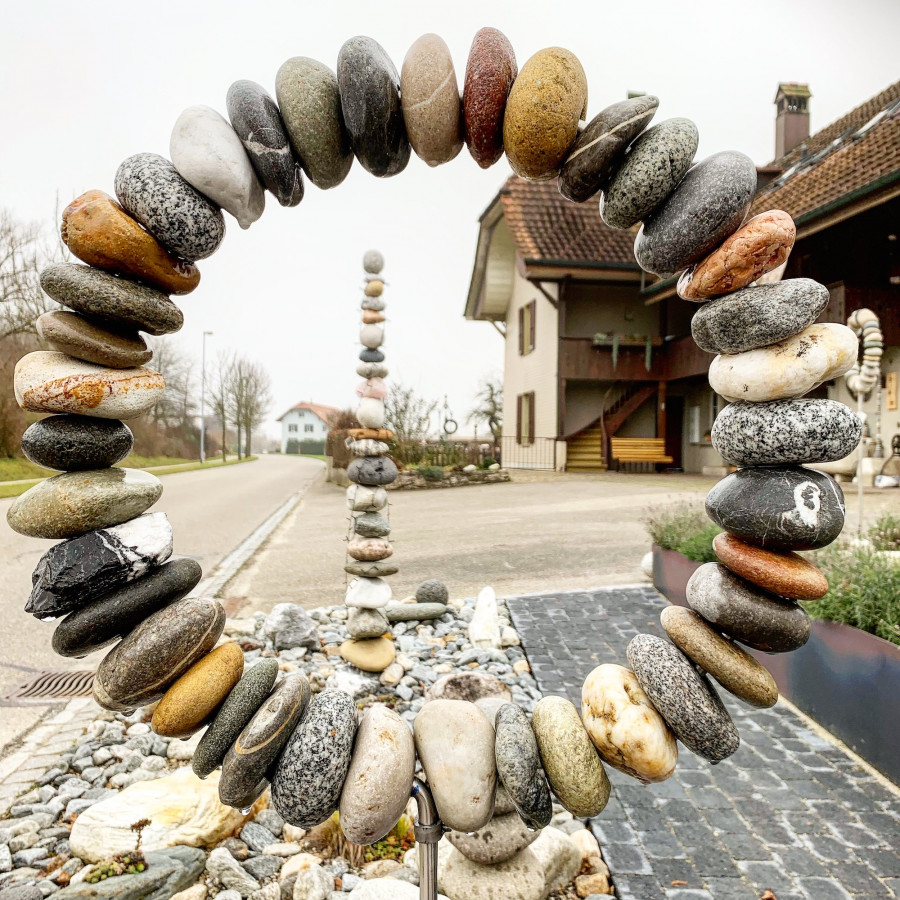 Steinkreise sind ganz besonders ausdrucksstarke Kunstwerke in deinem Garten oder auf dem Balkon. Majestätisch und doch leicht ragt das 140 cm hohe Naturkunstwerk in den Himmel. Schlicht und einfach - ein Steinkreis wie aus Kinderhand mit Kieselsteinen gelegt.