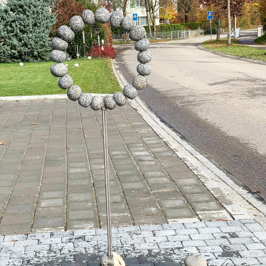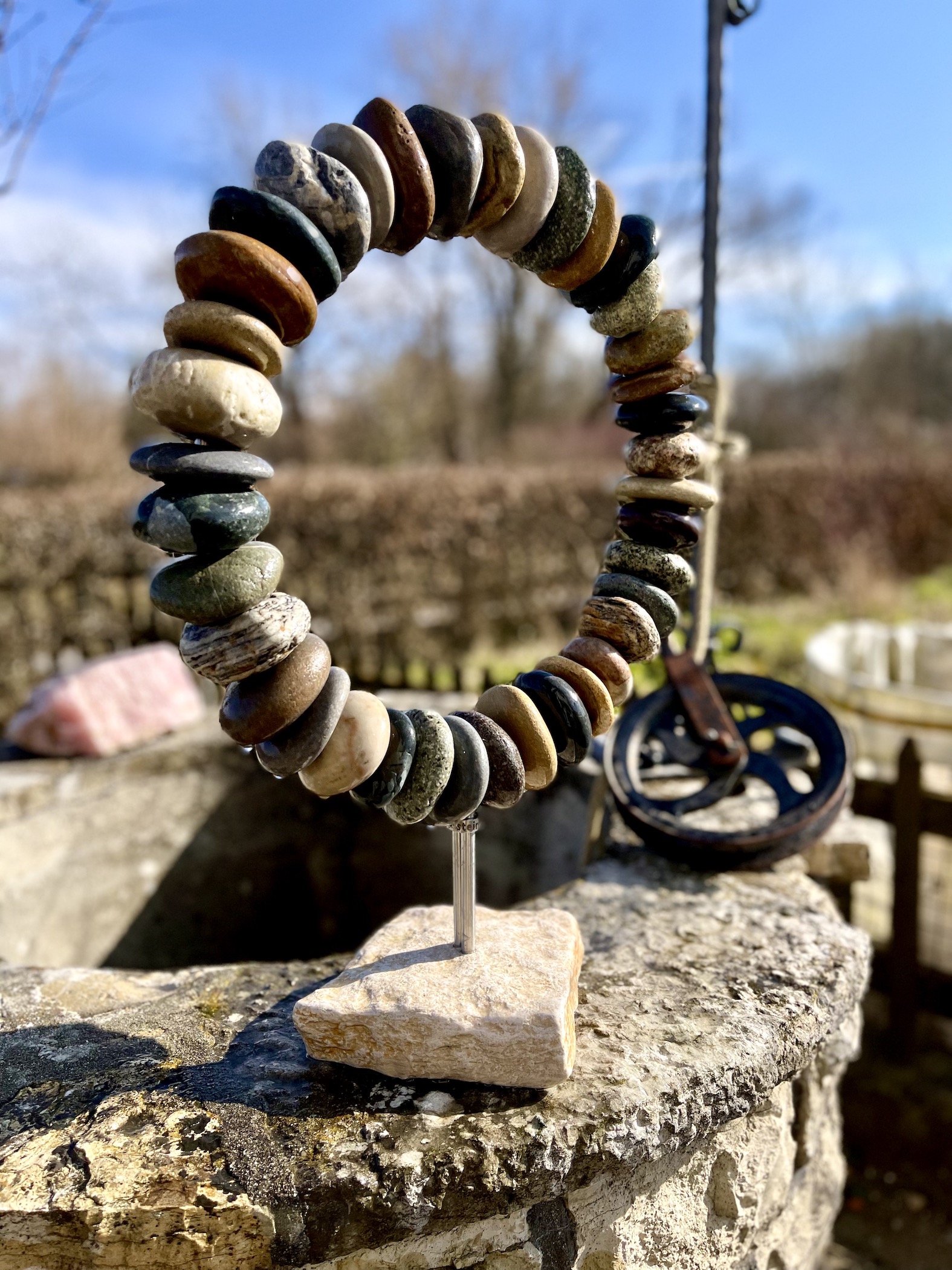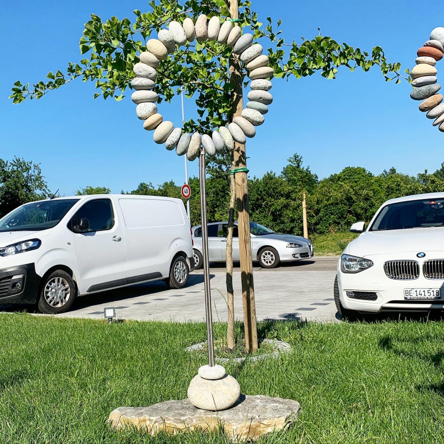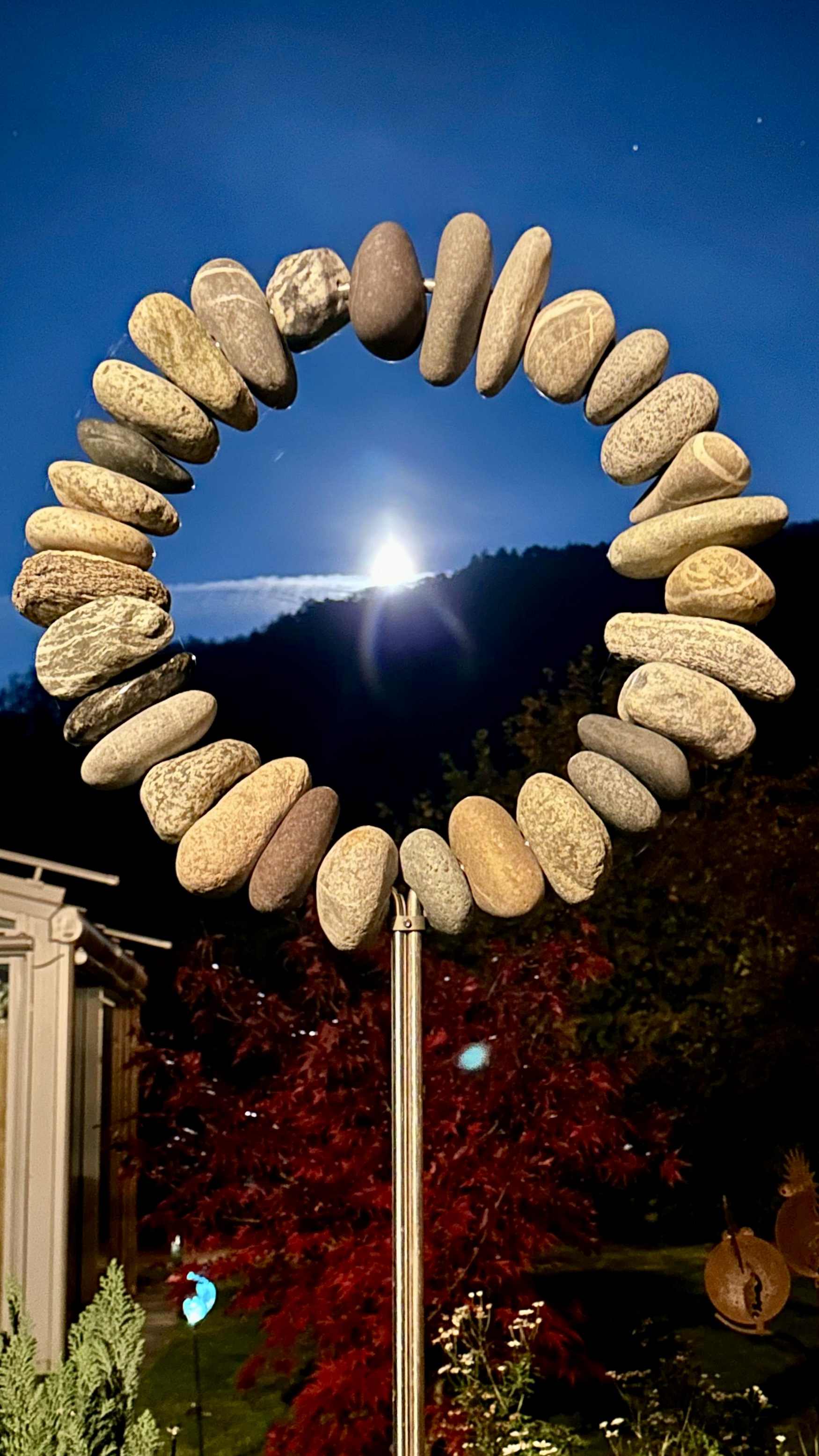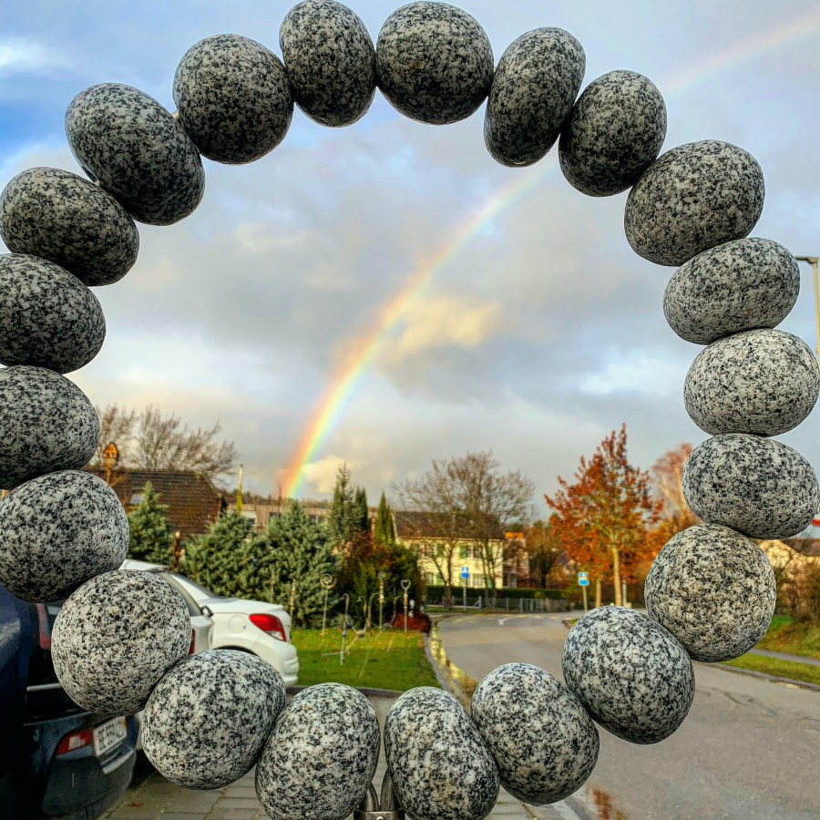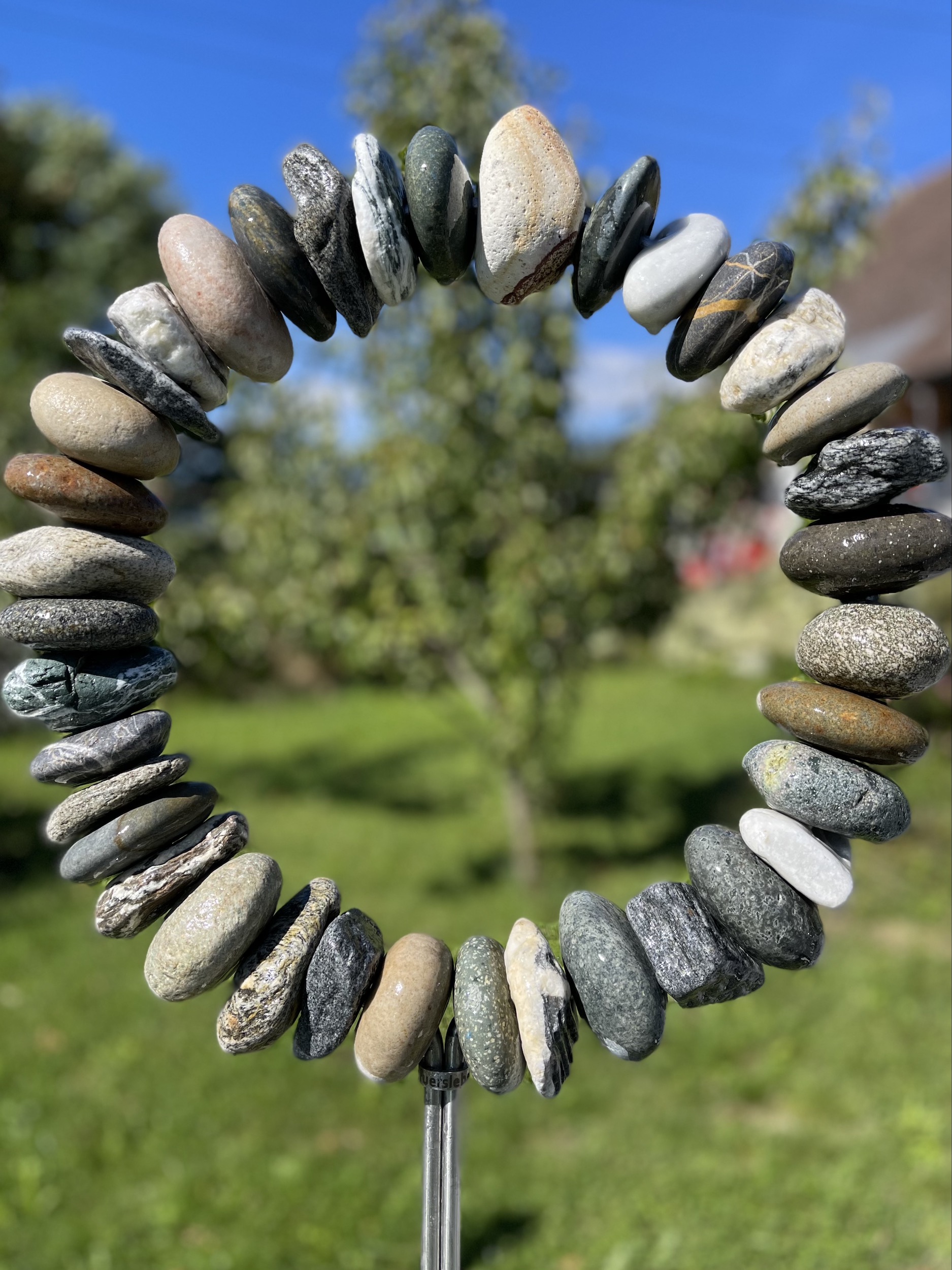 Steinkreise sind ganz besonders ausdrucksstarke Kunstwerke in deinem Garten oder auf dem Balkon. Majestätisch und doch leicht ragt das 140 cm hohe Naturkunstwerk in den Himmel. Schlicht und einfach - ein Steinkreis wie aus Kinderhand mit Kieselsteinen gelegt.